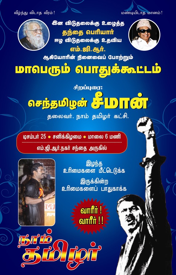 வருகின்ற 25-12-2010 சனிகிழமை மாலை 5 மணியளவில் எம்.ஜி,ஆர் நகர் மார்கெட் அருகில் இன விடுதலைக்கு போராடிய தந்தை பெரியாருக்கும், ஈழ விடுதலைக்கு உதவிய புரட்சித் தலைவர் அவர்களுக்கும் வீரவணக்கம் செலுத்தும் விதமாக நாம் தமிழர் கட்சி சார்பாக வீரவணக்க பொதுகூட்டம் நடைபெறவுள்ளது.