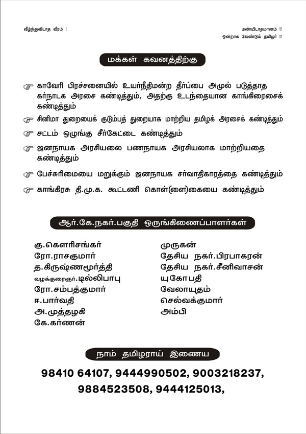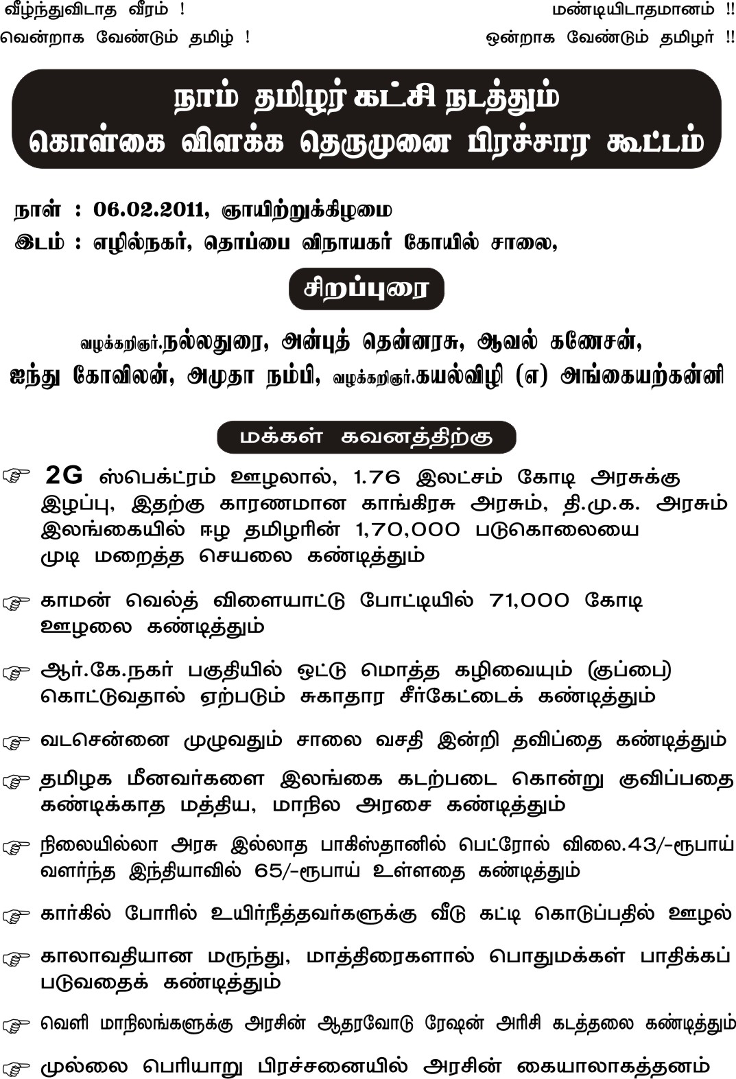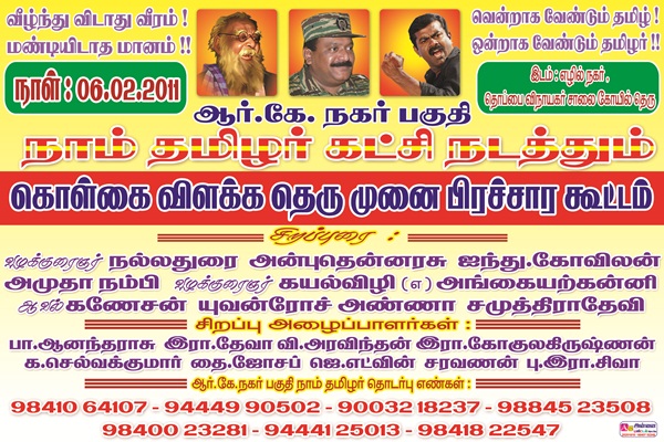 06.02.2011, ஞாயிற்றுக்கிழமை ஆர்.கே.நகர் பகுதி நாம் தமிழர் கட்சி நடத்தும் கொள்கை விளக்க தெரு முனை பிரச்சார கூட்டம் நடைபெறயுள்ளது