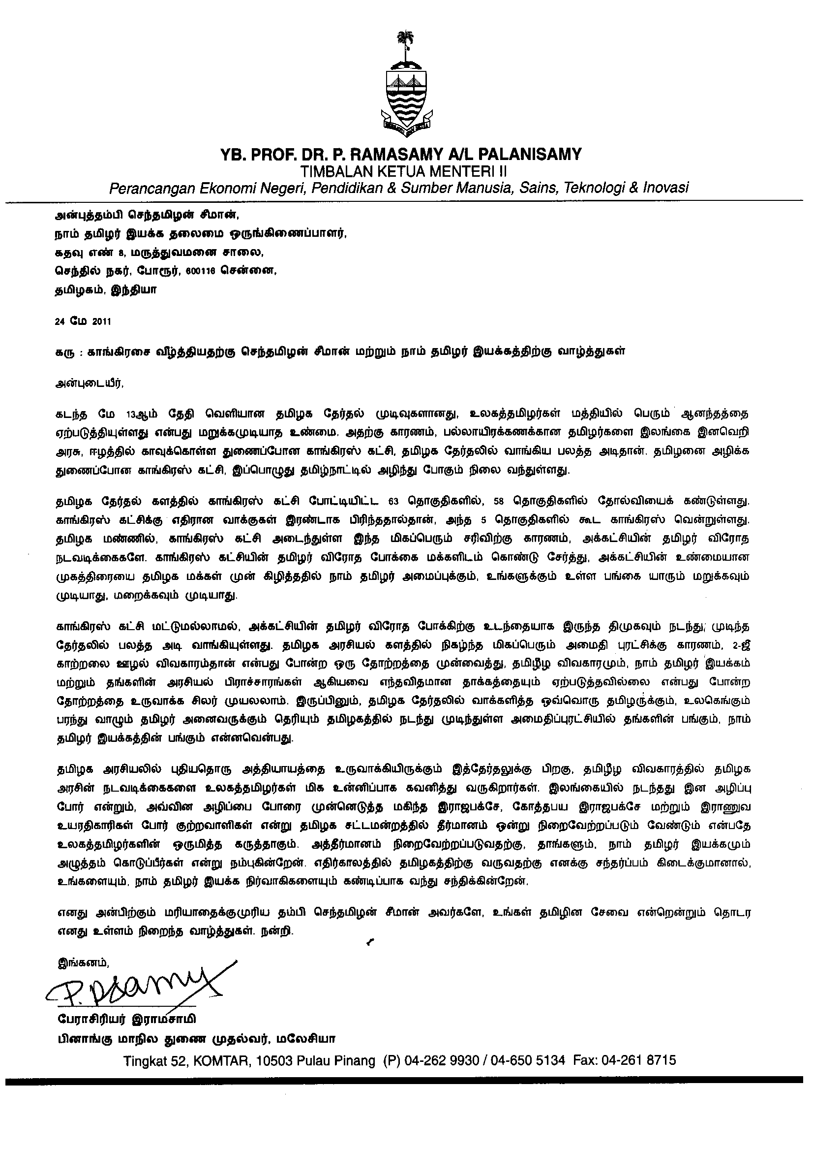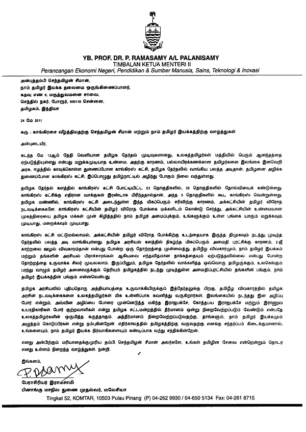 தமிழக தேர்தலில், காங்கிரஸ் கட்சியை வீழ்த்திய செந்தமிழன் சீமான் அவர்களுக்கு, பினாங்கு துணை முதல்வர் பேராசிரியர் இராமசாமி அவர்களின் வாழ்த்து கடிதம்.