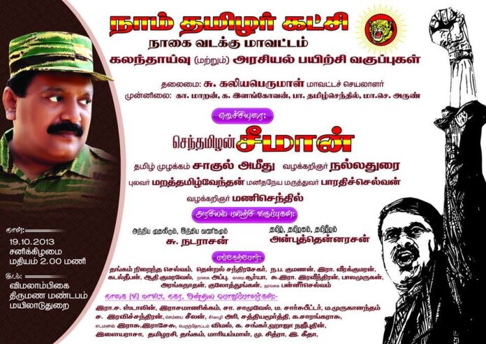 மயிலாடுதுறையில் வருகின்ற 19.10.2013 அன்று நாம் தமிழர் கட்சியின் தலைமை ஒருங்கிணைப்பாளர் செந்தமிழன் சீமான் அவர்கள் பங்கேற்க உள்ள கட்சியின் நாகை வடக்கு மாவட்ட கலந்தாய்வு மற்றும் அரசியல் பயிற்சி வகுப்புகள் நடைபெறவிருக்கின்றது.