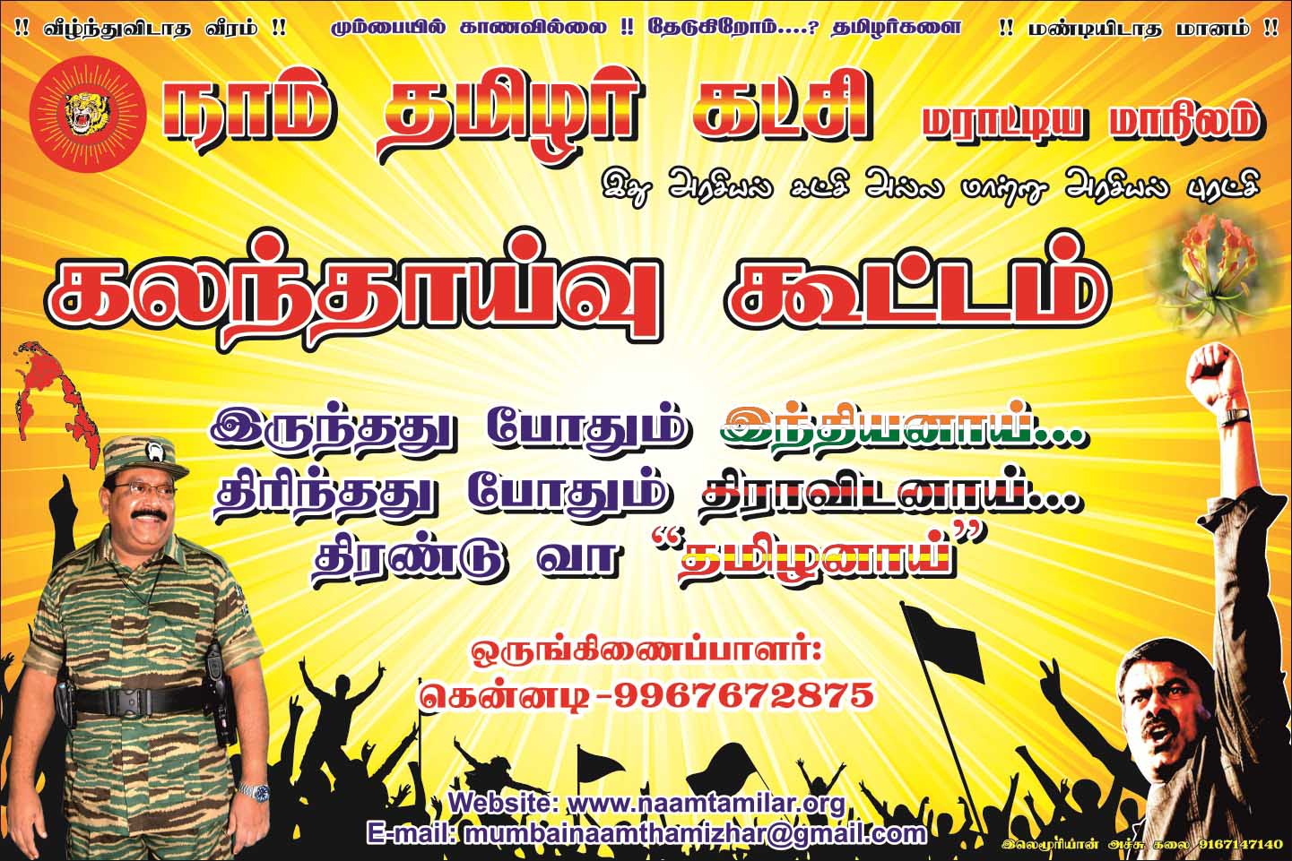 மராட்டிய மாநில நாம் தமிழர் கட்சி மராத்திய மாநிலம் கலந்தாய்வு கூட்டம் 23/03/2014 அன்று 3 மணிக்கு தாராவி காமராஜர் பள்ளியில் நடைபெற்றது. கூட்டத்தில் மாநில ஒருங்கிணைப்பாளர் திரு.கென்னெடி கலந்து கொண்டு ஆலோசனை வழங்கினார், திரு ஜார்ஜ்,சுந்தர், மணிகண்டன், பொன் கருணா, சிறிராம் முன்னிலை வகித்தார்ககள்.நாம் தமிழர் கட்சியின் உறுப்பினர்கள் கலந்து கொண்டார்கள் .