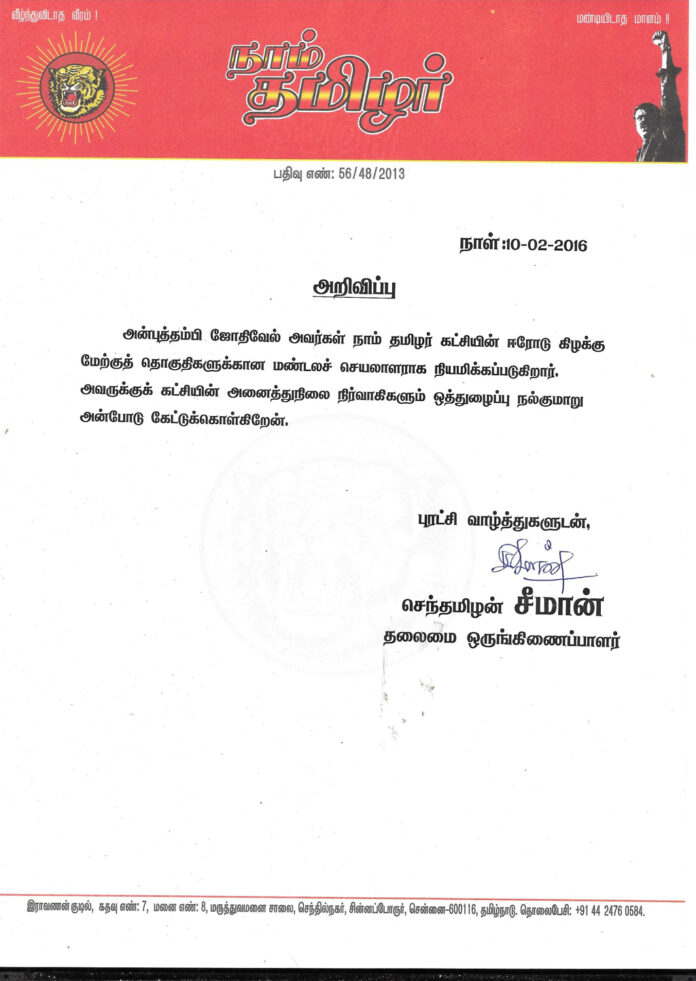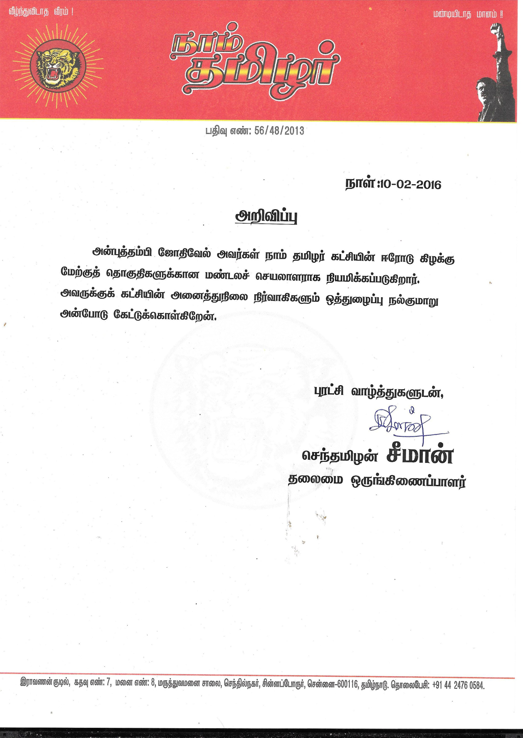 அன்புத்தம்பி ஜோதிவேல் அவர்கள் நாம் தமிழர் கட்சியின் ஈரோடு கிழக்கு மேற்குத் தொகுதிகளுக்கான மண்டலச் செயலாளராக நியமிக்கப்படுகிறார். அவருக்கு கட்சியின் அனைத்து நிலை நிர்வாகிகளும் ஒத்துழைப்பு நல்குமாறு அன்புடன் கேட்டுக்கொள்கிறேன்.