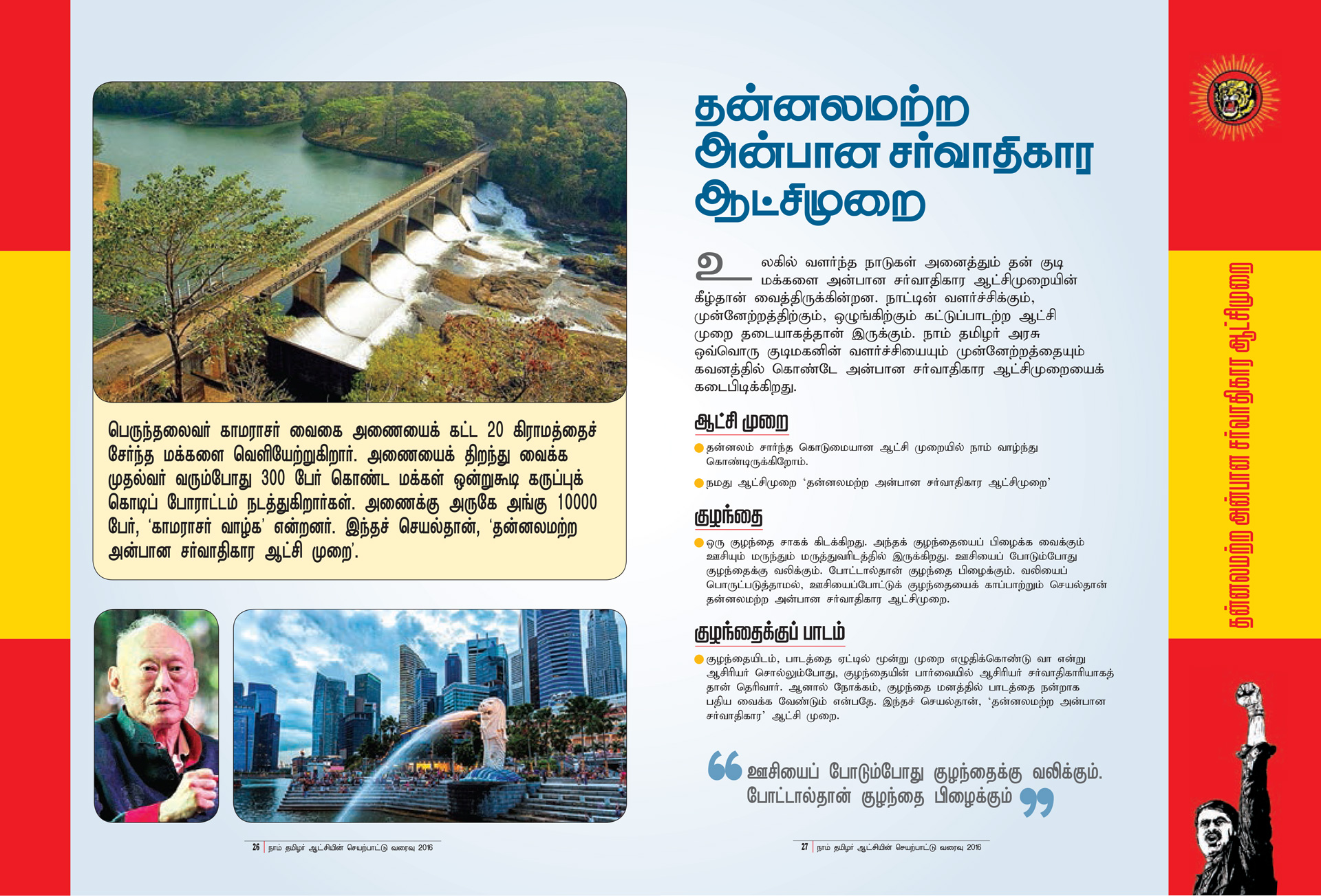 உலகில் வளர்ந்த நாடுகள் அனைத்தும் தன் குடி மக்களை அன்பான சர்வாதிகார ஆட்சிமுறையின் கீழ்தான் வைத்திருக்கின்றன. நாட்டின் வளர்ச்சிக்கும், முன்னேற்றத்திற்கும், ஒழுங்கிற்கும் கட்டுப்பாடற்ற ஆட்சிமுறை தடையாகத்தான் இருக்கும். நாம் தமிழர் அரசு ஒவ்வொரு குடிமகனின் வளர்ச்சியையும் முன்னேற்றத்தையும் கவனத்தில் கொண்டே அன்பான சர்வாதிகார ஆட்சிமுறையைக் கடைபிடிக்கிறது.