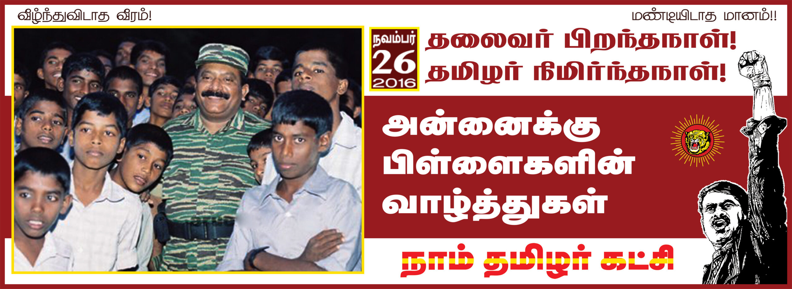 தமிழ்த்தேசியத் தலைவர் மேதகு வே.பிரபாகரன் அவர்களின் 62ஆம் ஆண்டு பிறந்தநாளை (26-11-2016) முன்னிட்டு, இன்று 25-11-2016 வெள்ளிக்கிழமை, காலை 10 மணிக்கு, சென்னை இராஜீவ் காந்தி அரசு பொது மருத்துவமனையில் நாம் தமிழர் கட்சி நடத்தும் மாபெரும் குருதிக்கொடை முகாம் நடைபெறவுள்ளது. இதில் நாம் தமிழர் கட்சியின் தலைமை ஒருங்கிணைப்பாளர் செந்தமிழன் சீமான் அவர்கள் தலைமையேற்று குருதிக்கொடை முகாமை துவக்கி வைக்கின்றார்.