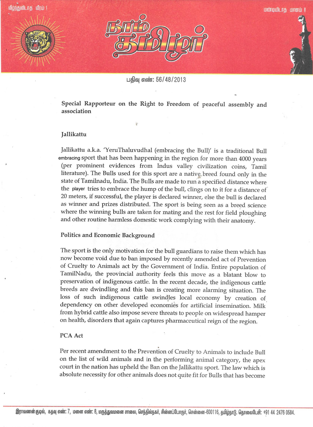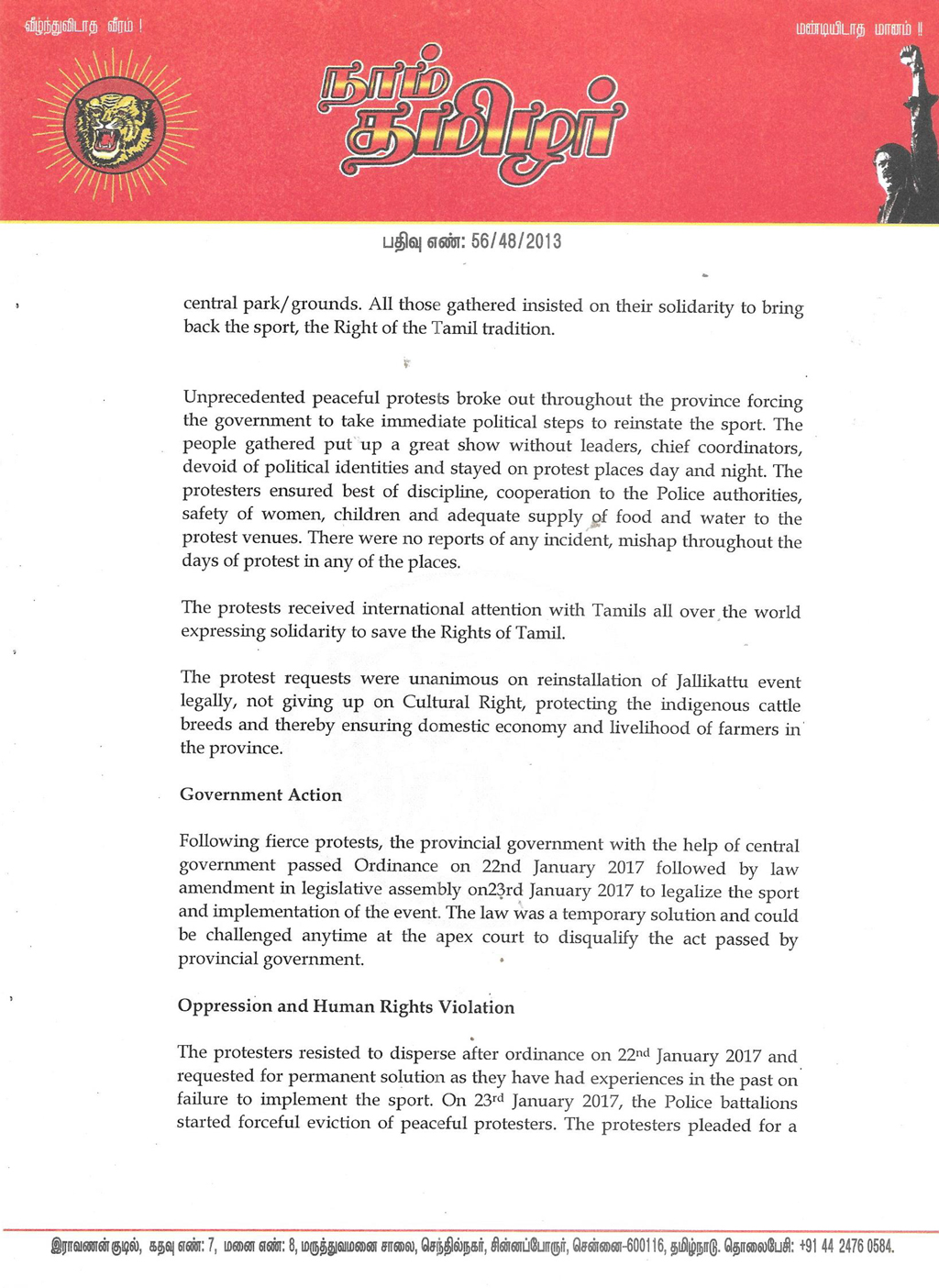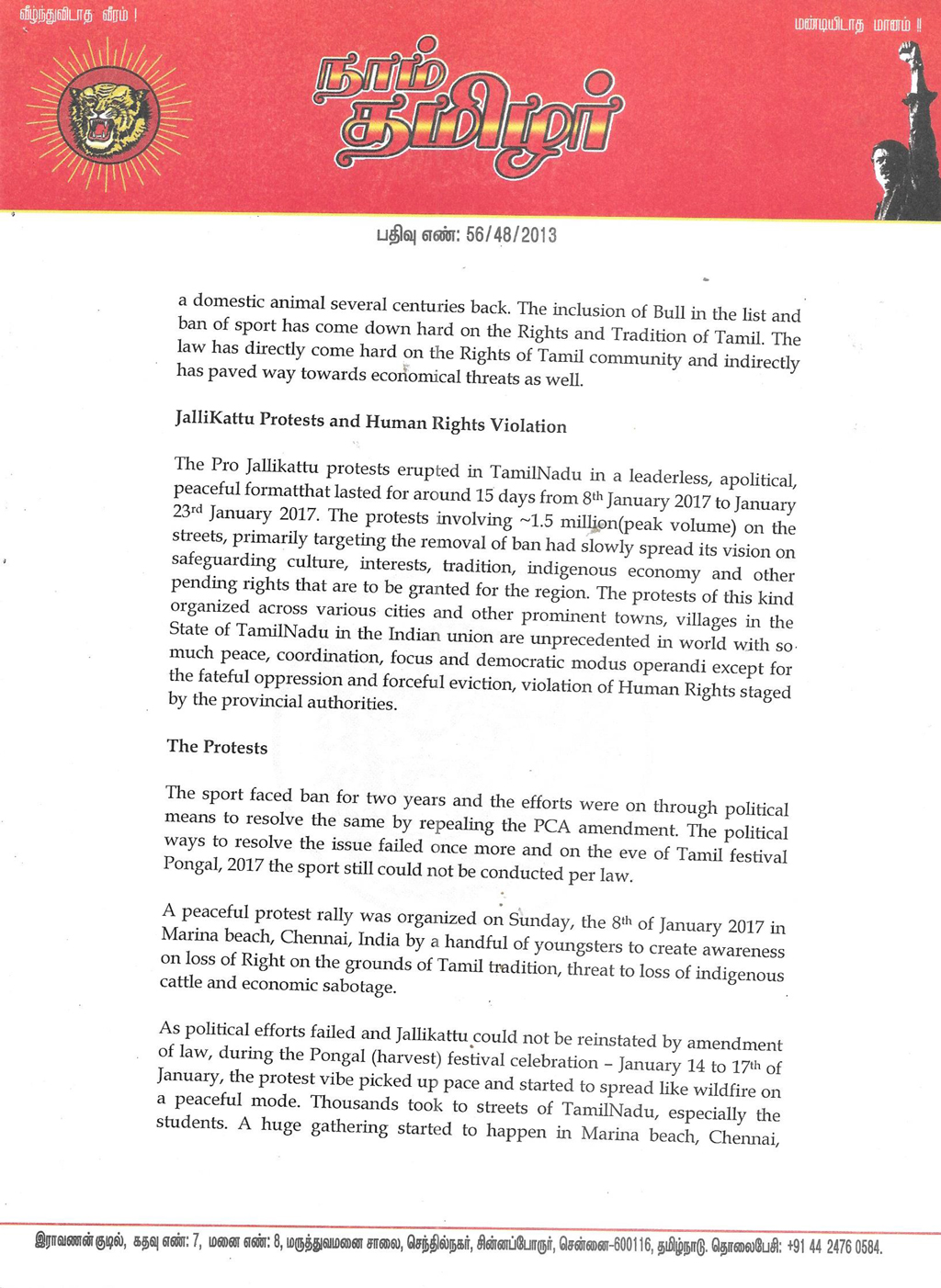 ஜெனீவாவில் உள்ள ஐக்கிய நாடுகளுக்கான மனித உரிமை ஆணையத்தில் நாம் தமிழர் கட்சியின் தலைமை ஒருங்கிணைப்பாளர் செந்தமிழன் சீமான் அவர்களின் சார்பாக முதன்மை ஒருங்கிணைப்பாளர் முனைவர் பால் நியுமன் அவர்கள், சல்லிக்கட்டுப் போராட்டத்தில் நடந்த நிகழ்வுகளை மிகத் தெளிவாக விளக்கி புகார் மனு ஒன்றைக் கடந்த 31-01-2017 அன்று நேரில் சென்று அளித்துள்ளார்.
