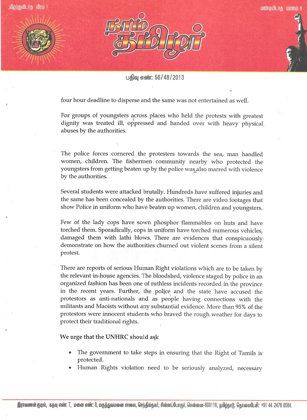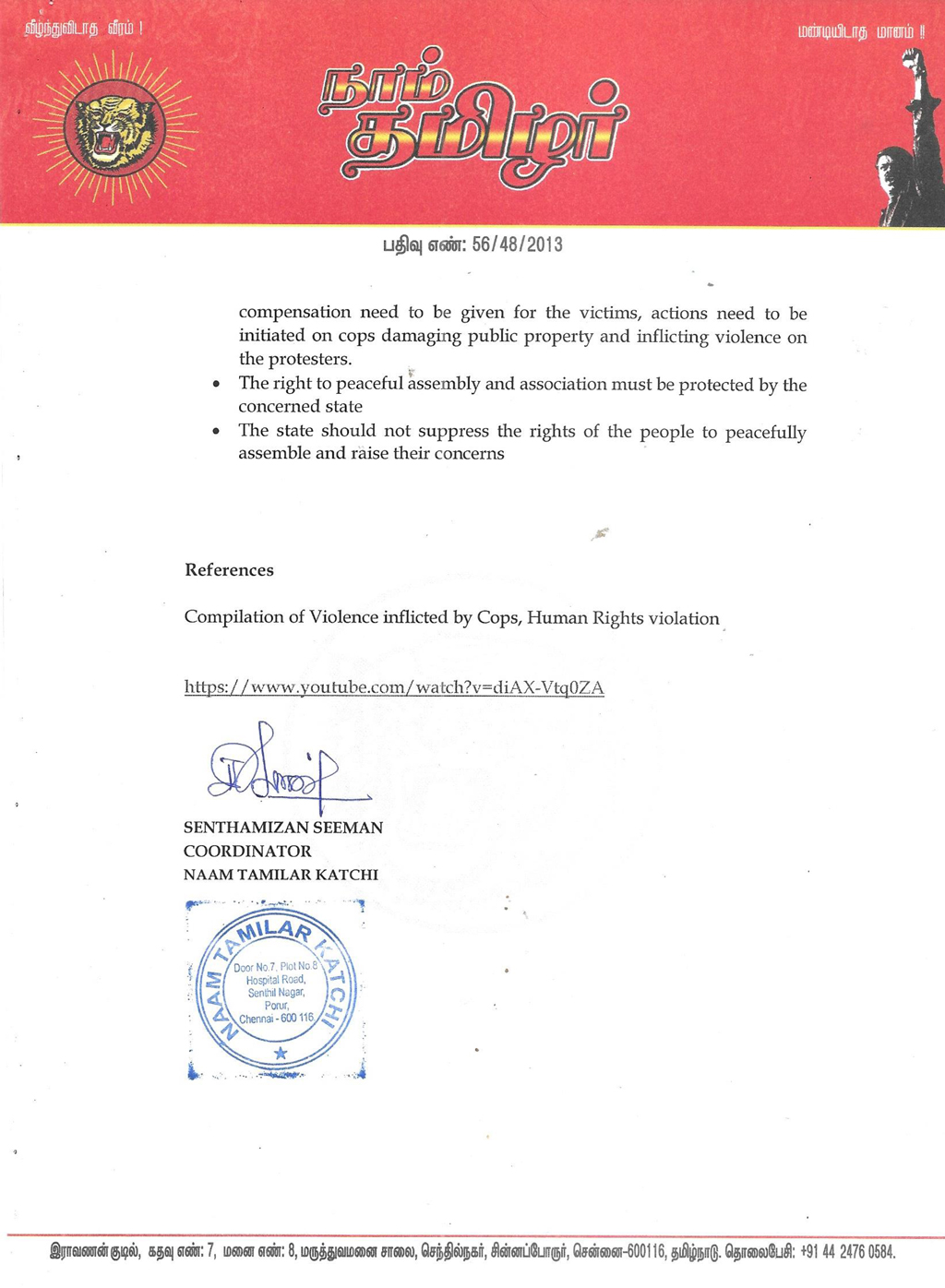 4. இனிமேல் எப்போதும் அமைதி வழி போராட்டங்களைத் தமிழக அரசு அல்லது இந்திய அரசு வன்முறையைக் கொண்டு அடக்கக் கூடாது என வலியுறுத்தியும்,