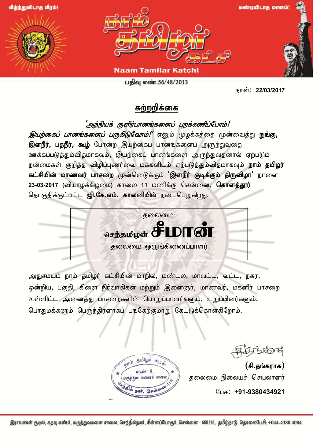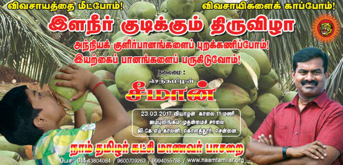 இயற்கைப் பானங்களைப் பருகிடுவோம்!’ எனும் முழக்கத்தை முன்வைத்து நுங்கு, இளநீர், பதநீர், கூழ் போன்ற இயற்கைப் பானங்களைப் அருந்துவதை ஊக்கப்படுத்தும்விதமாகவும், இயற்கைப் பானங்களை அருந்துவதனால் ஏற்படும் நன்மைகள் குறித்த விழிப்புணர்வை மக்களிடம் ஏற்படுத்தும்விதமாகவும் நாம் தமிழர் கட்சியின் மாணவர் பாசறை முன்னெடுக்கும் ‘இளநீர் குடிக்கும் திருவிழா’ நாளை 23-03-2017 (வியாழக்கிழமை) காலை 11 மணிக்கு, சென்னை, கொளத்தூர் தொகுதிக்குட்பட்ட ஜி.கே.எம். காலனியில் நடைபெறுகிறது. இந்நிகழ்வில் பங்கேற்கும் பொதுமக்கள் அனைவருக்கும் இளநீர் வழங்கி, இயற்கைப் பானங்களைப் பருகிட ஊக்கபடுத்தப்படும் இதில் தலைமை ஒருங்கிணைப்பாளர் சீமான் அவர்கள் பங்கேற்று நிகழ்வைத் தொடங்கி வைக்கிறார்.