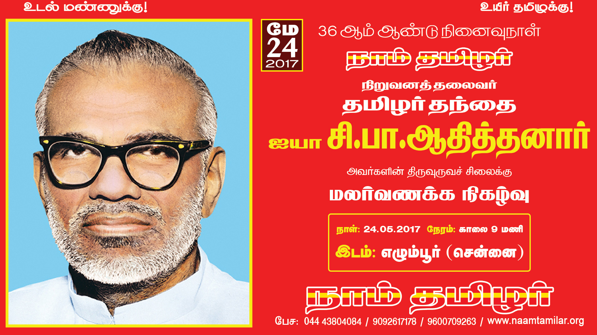 அறிவிப்பு: 24-05-2017 ‘தமிழர் தந்தை’ சி.பா. ஆதித்தனாரின் 36ஆம் ஆண்டு நினைவுநாள் – மலர் வணக்க நிகழ்வு | எழும்பூர் | நாம் தமிழர் கட்சி