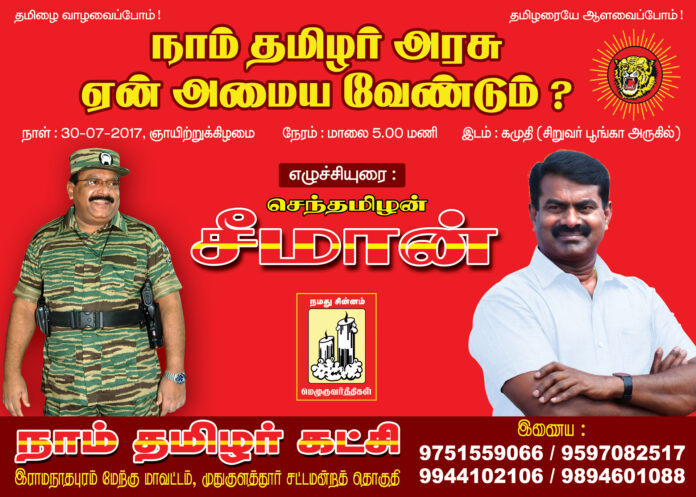 நாம் தமிழர் அரசு ஏன் அமையவேண்டும்? என்ற தலைப்பில் நாம் தமிழர் கட்சியின் கொள்கை விளக்கப் பொதுக்கூட்டம் வருகின்ற 30-07-2017 ஞாயிற்றுக்கிழமை மாலை 5 மணிக்கு இராமநாதபுரம் மாவட்டம் முதுகுளத்தூர் சட்டமன்றத் தொகுதிக்குட்பட்ட கமுதியில் (சிறுவர் பூங்கா அருகில்)  நடைபெறவிருக்கிறது.