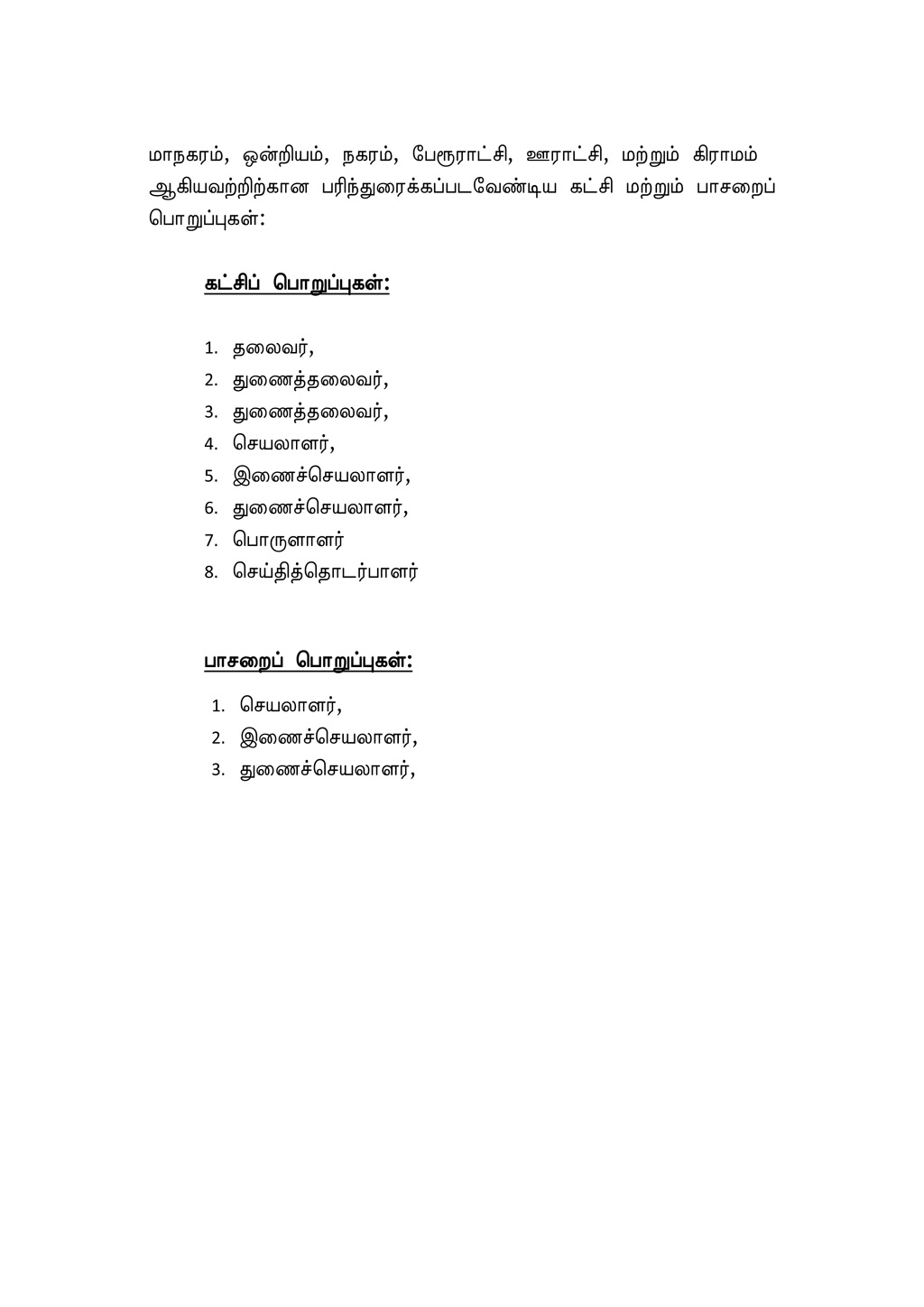 மாநகரம், ஒன்றியம், நகரம், பேரூராட்சி, ஊராட்சி, மற்றும் கிராமம் ஆகியவற்றிற்கான பரிந்துரைக்கப்படவேண்டிய கட்சி மற்றும் பாசறைப் பொறுப்புகள்