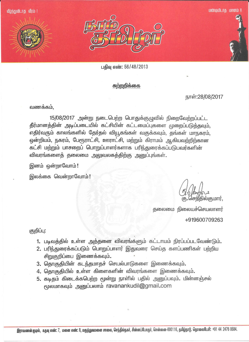 கடந்த 15-08-2017 அன்று நடைபெற்ற நாம் தமிழர் கட்சியின் மாநிலப் பொதுக்குழுவில் நிறைவேற்றப்பட்ட தீர்மானத்தின் அடிப்படையில் கட்சியின் கட்டமைப்புகளை முறைப்படுத்தவும், எதிர்வரும் காலங்களில் தேர்தல் வியூகங்கள் வகுக்கவும், தங்கள் மாநகரம், ஒன்றியம், நகரம், பேரூராட்சி, ஊராட்சி, மற்றும் கிராமம் ஆகியவற்றிற்கான கட்சி மற்றும் பாசறைப் பொறுப்பாளர்களாக பரிந்துரைக்கப்படுபவர்களின் விவரங்களைத் தலைமை அலுவலகத்திற்கு அனுப்புங்கள்.