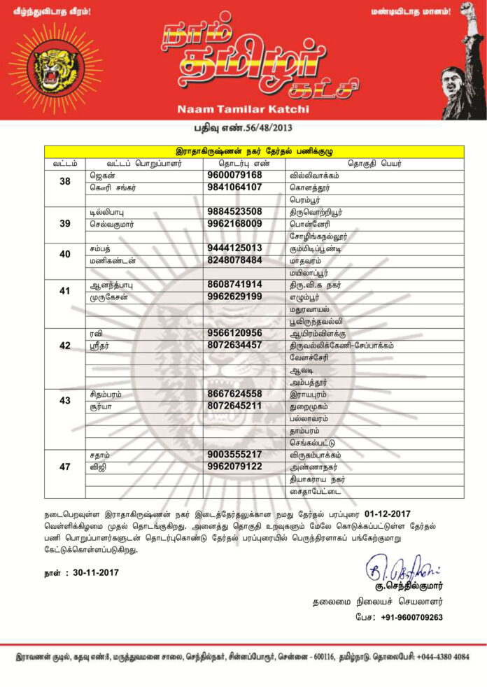 நடைபெறவுள்ள இராதாகிருஷ்ணன் நகர் இடைத்தேர்தலுக்கான நமது தேர்தல் பரப்புரைப் பணிகள் நாளை 01-12-2017 (வெள்ளிக்கிழமை) முதல் தொடங்குகிறது. அனைத்து தொகுதி உறவுகளும் மேலே கொடுக்கப்பட்டுள்ள தேர்தல் பணி பொறுப்பாளர்களுடன் தொடர்புகொண்டு தேர்தல் பரப்புரையில் பெருந்திரளாகப் பங்கேற்குமாறு கேட்டுக்கொள்கிறோம்.