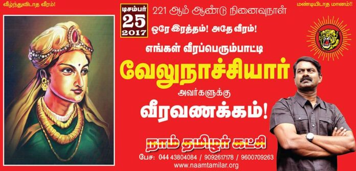 வீரப்பெரும்பாட்டியார் வேலுநாச்சியாரின் அவர்களின் 221ஆம் ஆண்டு நினைவுநாளையொட்டி நாளை 25-12-2017 (திங்கட்கிழமை) காலை 10 மணிக்கு சென்னை, வளசரவாக்கத்தில் உள்ள நாம் தமிழர் கட்சியின் தலைமை அலுவலகத்தில் மலர்வணக்க நிகழ்வு நடைபெறவிருக்கிறது. வீரப்பெரும்பாட்டியார் வேலுநாச்சியாரின் திருவுருவப்படத்திற்கு தலைமை ஒருங்கிணைப்பாளர் சீமான் அவர்கள் மாலை அணிவித்து மலர்வணக்கம் செய்யவிருக்கிறார்.