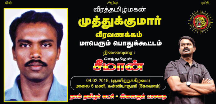 நாம் தமிழர் கட்சியின் எழுச்சி மிகுந்த இளைஞர் பாசறை நடத்துகின்ற மாவீரன் முத்துக்குமாரின் 9ஆம் ஆண்டு நினைவைப் போற்றுகிற மாபெரும் வீரவணக்கப் பொதுக்கூட்டம் 04-02-2018 (ஞாயிற்றுக்கிழமை) மாலை 5 மணிக்கு கன்னியாகுமரி, கோவளம் பகுதியில் நடைபெறவிருக்கிறது.