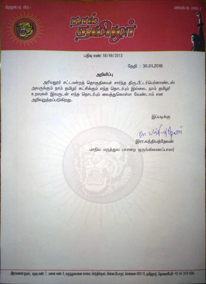 அரியலூர் சட்டமன்றத் தொகுதியைச் சார்ந்த திரு. பீட்டர் பெர்னாண்டஸ் அவருக்கும் நாம் தமிழர் கட்சிக்கும் எந்த தொடர்புக்கும் இல்லை. நாம் தமிழர் உறவுகள் இவருடன் எந்தத் தொடர்பும் வைத்துக்கொள்ளவேண்டாம் என அறிவுறுத்தப்படுகிறது.