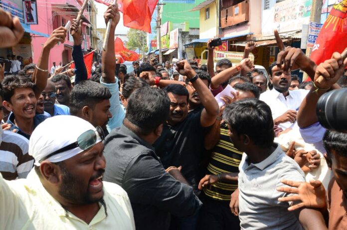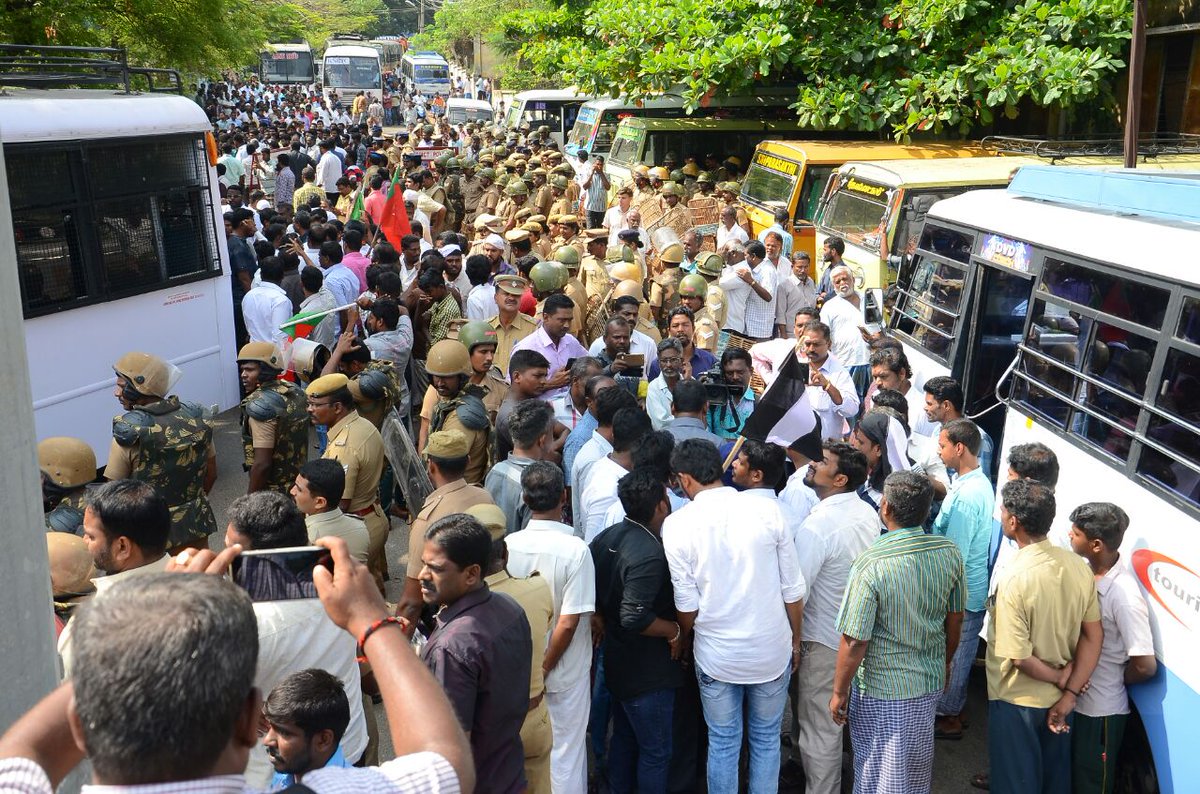 ஏற்கனவே அறிவித்திருந்தபடி திருநெல்வேலி மாவட்டம் செங்கோட்டை வாஞ்சிநாதன் சிலை அருகே பேரணியாக சென்று மறியலில் ஈடுபட்ட தலைமை ஒருங்கிணைப்பாளர் சீமான் உட்பட 100க்கும் மேற்பட்ட நாம் தமிழர் உறவுகள் கைது செய்யப்பட்டுள்ளனர். அனைவரும் அருகில் உள்ள திருமண மண்டபத்தில் அடைக்கப்பட்டுள்ளனர்.