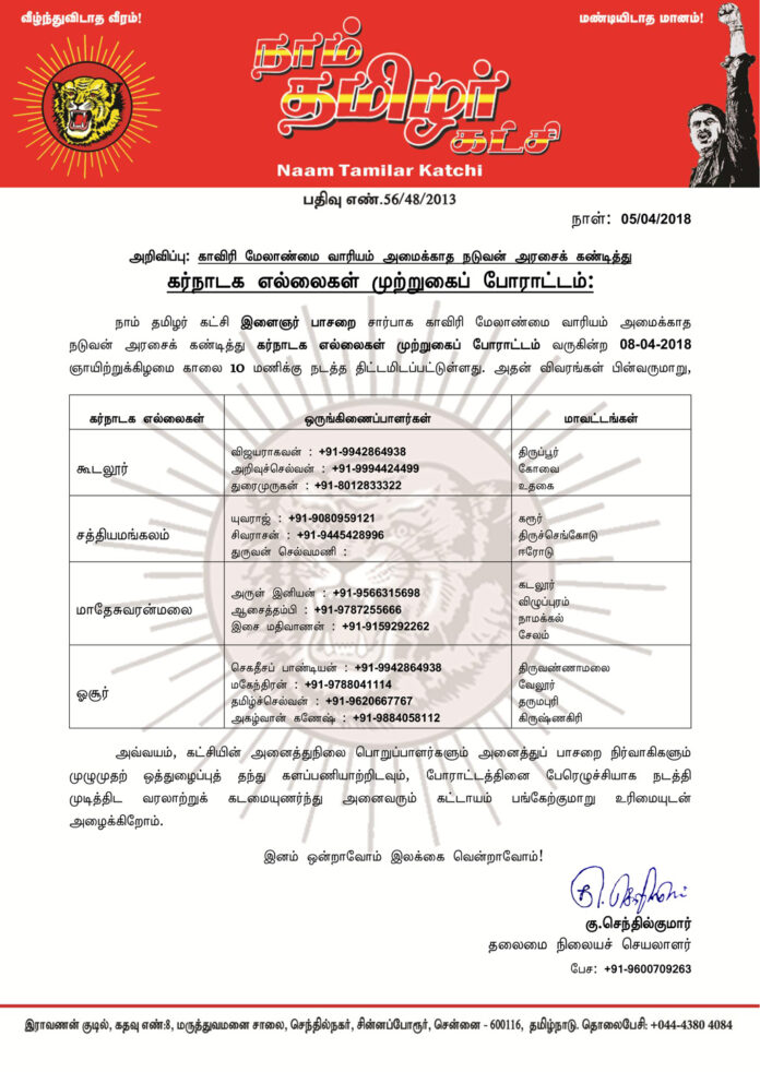 நாம் தமிழர் கட்சி இளைஞர் பாசறை சார்பாக காவிரி மேலாண்மை வாரியம் அமைக்காத நடுவன் அரசைக் கண்டித்து கர்நாடக எல்லைகள் முற்றுகைப் போராட்டம் வருகின்ற 08-04-2018 ஞாயிற்றுக்கிழமை காலை 10 மணிக்கு நடத்த திட்டமிடப்பட்டுள்ளது. அதன் விவரங்கள் பின்வருமாறு,