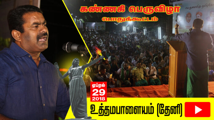 மறம் வீழ்த்தி; அறம் காத்த மானத்தமிழ் மறத்தி நமது பெரும்பாட்டி கண்ணகி தமிழ் இனத்தின் பெருமைக்குரிய அடையாளம் என்பதை முன்னிறுத்தி கண்ணகியின் பெரும்புகழைப் போற்றும் விதமாகவும், ‘பண்பாட்டு புரட்சி இல்லாது; அரசியல் புரட்சி வெல்லாது!’ என்ற தத்துவ முழக்கத்திற்கேற்பவும், நாம் தமிழர் கட்சியின் வீரத்தமிழர் முன்னணி முன்னெடுத்த கண்ணகி பெருவிழா பொதுக்கூட்டம் 29-04-2018 ஞாயிற்றுக்கிழமை மாலை 3 மணியளவில் தேனி மாவட்டம் உத்தமபாளையத்தில் நடைபெற்றது. இதில் நாம் தமிழர் கட்சியின் தலைமை ஒருங்கிணைப்பாளர் சீமான் அவர்கள் தலைமையேற்று பெருவிழா பேருரையாற்றினார். முன்னதாக பறையிசை, மள்ளர் கம்பம், கருப்பு நாடகம் உள்ளிட்ட கலை நிகழ்ச்சிகள் நடைபெற்றது.