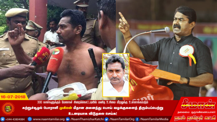 கூடங்குளம் அணு உலை எதிர்ப்புப் போராட்டத்தில் பங்கேற்றதற்காகப் போடப்பட்ட வழக்கில் கடந்த ஆண்டுச் செப்டம்பர் மாதம் கைதுசெய்யப்பட்டு 300 நாள்களுக்கும் மேலாகச் சிறைக்கொட்டடியில் மனித உரிமை மீறலுக்கு உள்ளாக்கப்படும் சுற்றுச்சூழல் போராளி முகிலன் மீதான அனைத்து பொய் வழக்குகளைத் திரும்பப்பெற்று உடனடியாக விடுதலை செய்யக்கோரி நாம் தமிழர் கட்சியின் தலைமை ஒருங்கிணைப்பாளர் சீமான் அவர்கள் இன்று (16-07-2018) வெளியிட்டுள்ள அறிக்கையில் கூறியிருப்பதாவது,