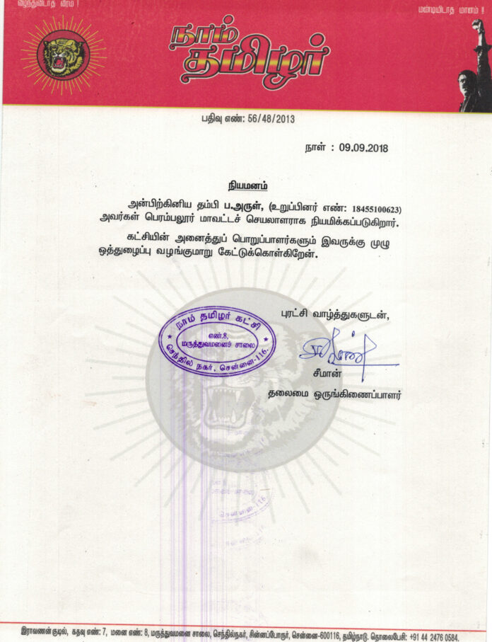 நாம் தமிழர் கட்சியின் பெரம்பலூர் மாவட்டச் செயலாளராக ப.அருள் (18455100623) அவர்களை தலைமை ஒருங்கிணைப்பாளர் சீமான் அவர்களால் இன்று 09-09-2018 முதல் நியமிக்கப்படுகிறார் என்பதை தெரிவித்துக்கொள்கிறோம்.