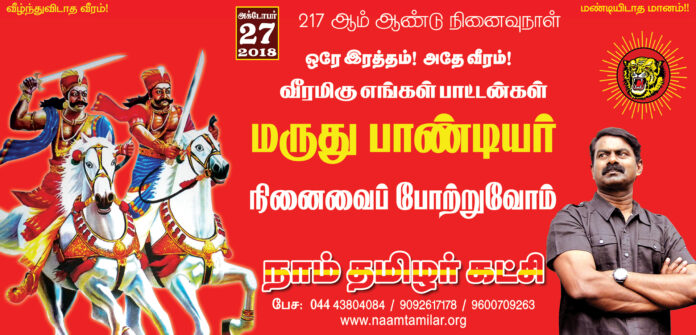 அறிவிப்பு: வீரப்பெரும் பாட்டன்கள் மருது பாண்டியர் நினைவுநாள் மலர் வணக்க நிகழ்வு – சென்னை | நாம் தமிழர் கட்சி