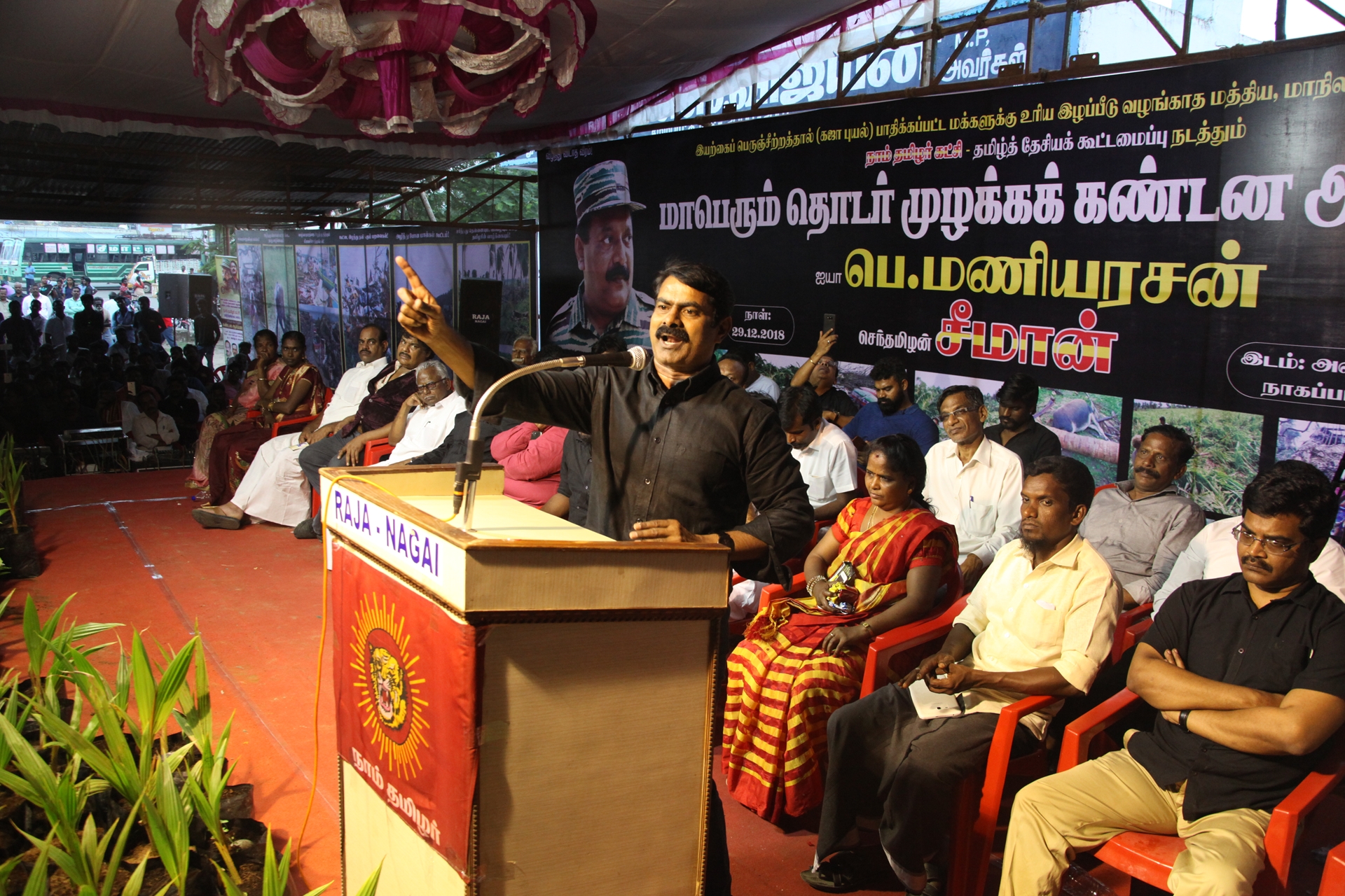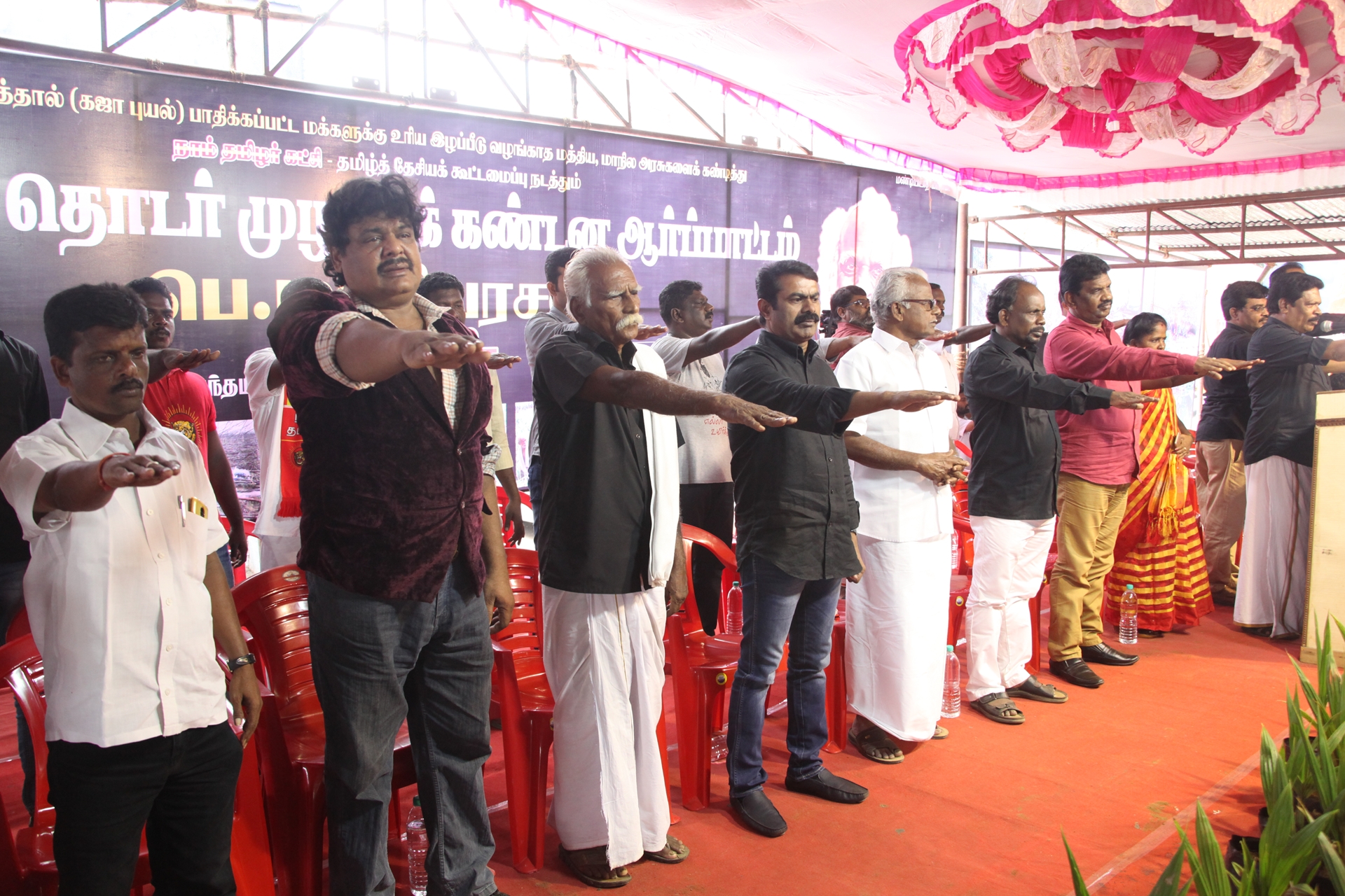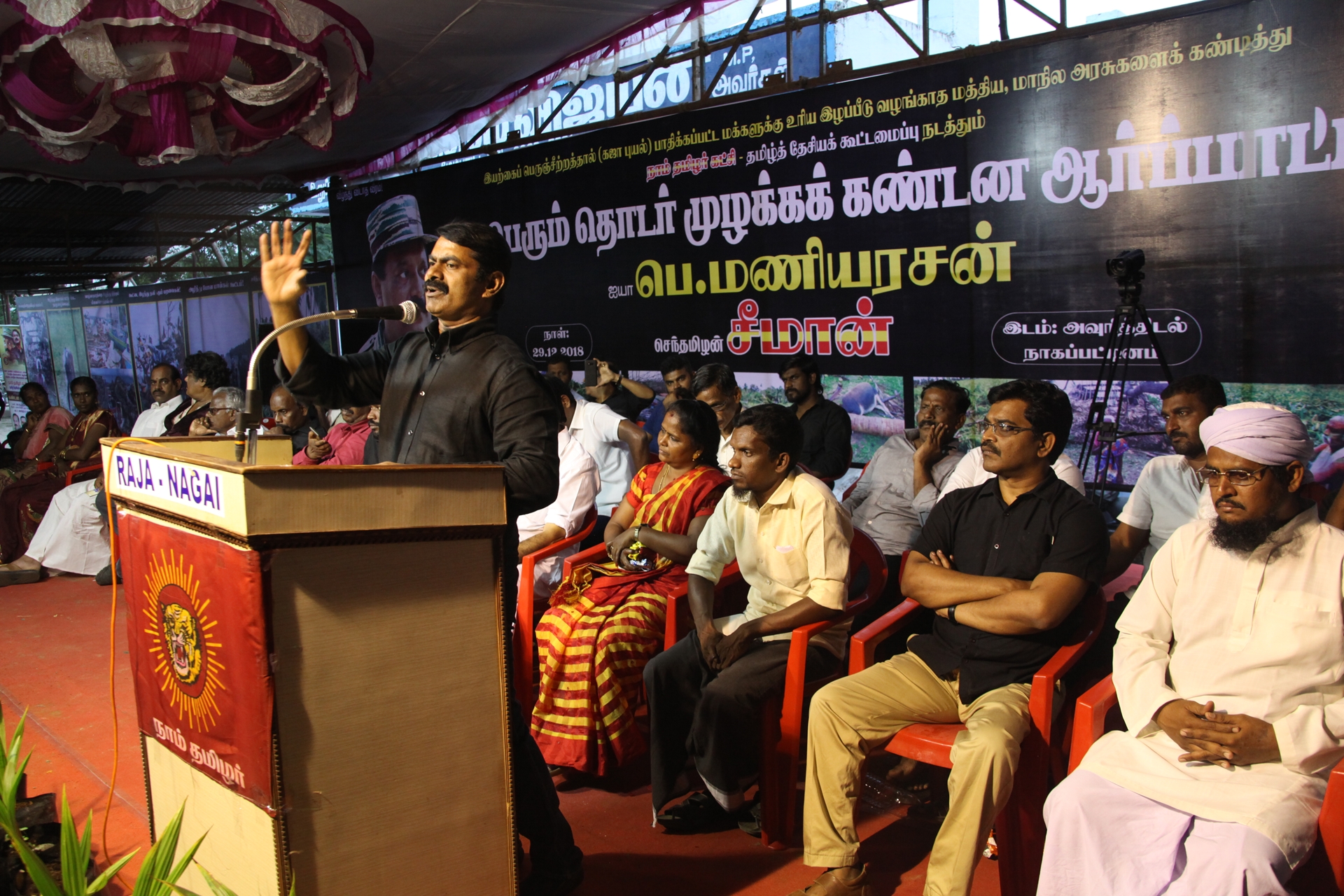 கஜா எனும் பெரும்புயலின் கடுஞ்சீற்றத்தால் தமிழகத்தின் வளமான 8 மாவட்டங்கள் பெரும்பாதிப்பிற்குள்ளாகியுள்ளது. புயலால் பாதிக்கப்பட்டு 40 நாள்களுக்கு மேலாகியும் மீளமுடியாது கண்ணீரில் தத்தளிக்கும் மக்களைப் புறக்கணிக்கும் மத்திய, மாநில அரசுகளைக் கண்டித்து நாம் தமிழர் கட்சி மற்றும் தமிழ்த்தேசியக் கூட்டமைப்பு நடத்தும் மாபெரும் தொடர் முழக்க கண்டன ஆர்ப்பாட்டம் நேற்று 29-12-2018 சனிக்கிழமை காலை 10 மணிமுதல் மாலை 06 மணிவரையிலும் நாகப்பட்டினம் அவுரித் திடலில் தமிழ்த்தேசியப் பேரியக்கத்தின் தலைவர் பெ.மணியரசன் தலைமையில் நடைபெற்றது.
