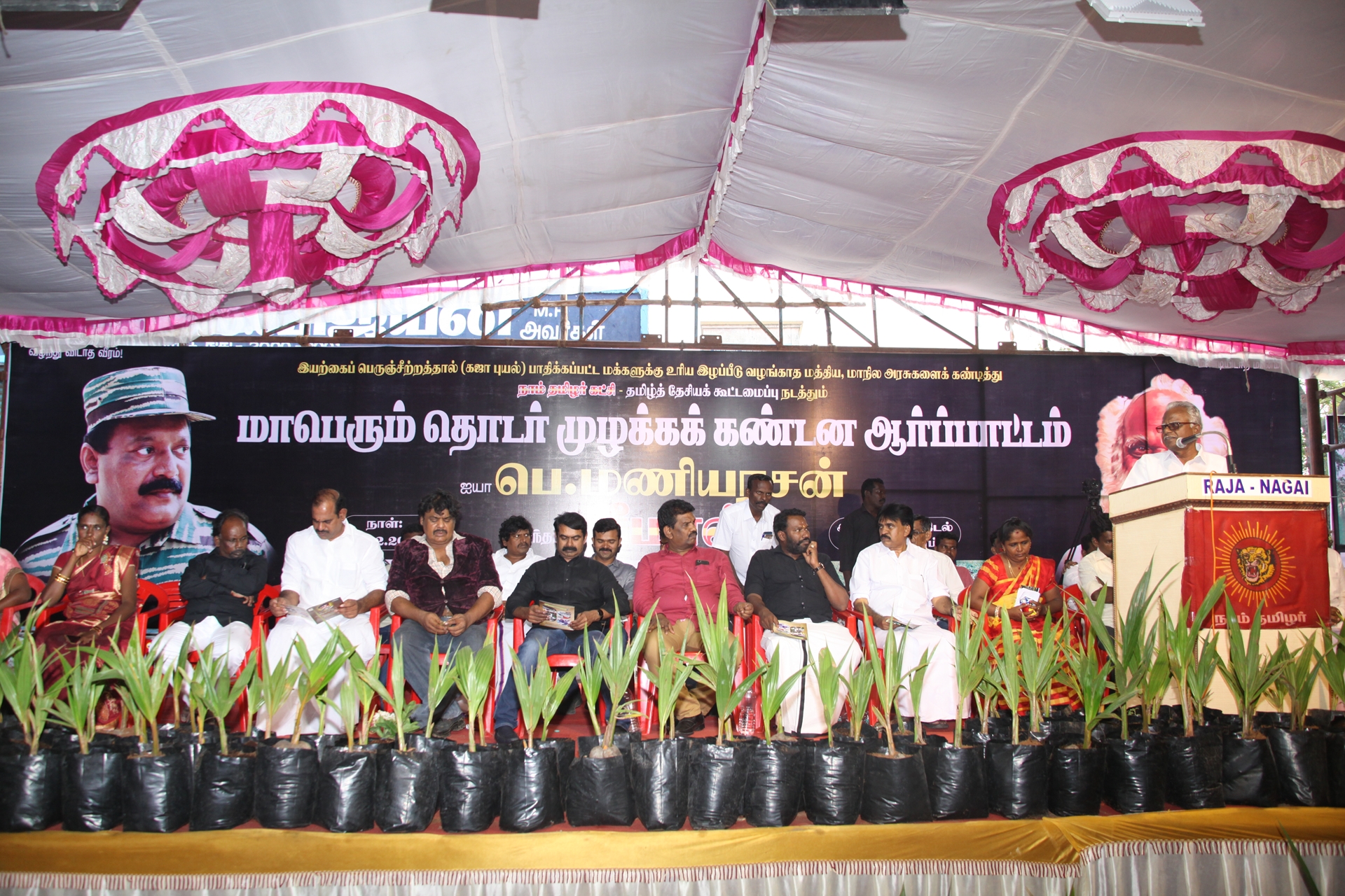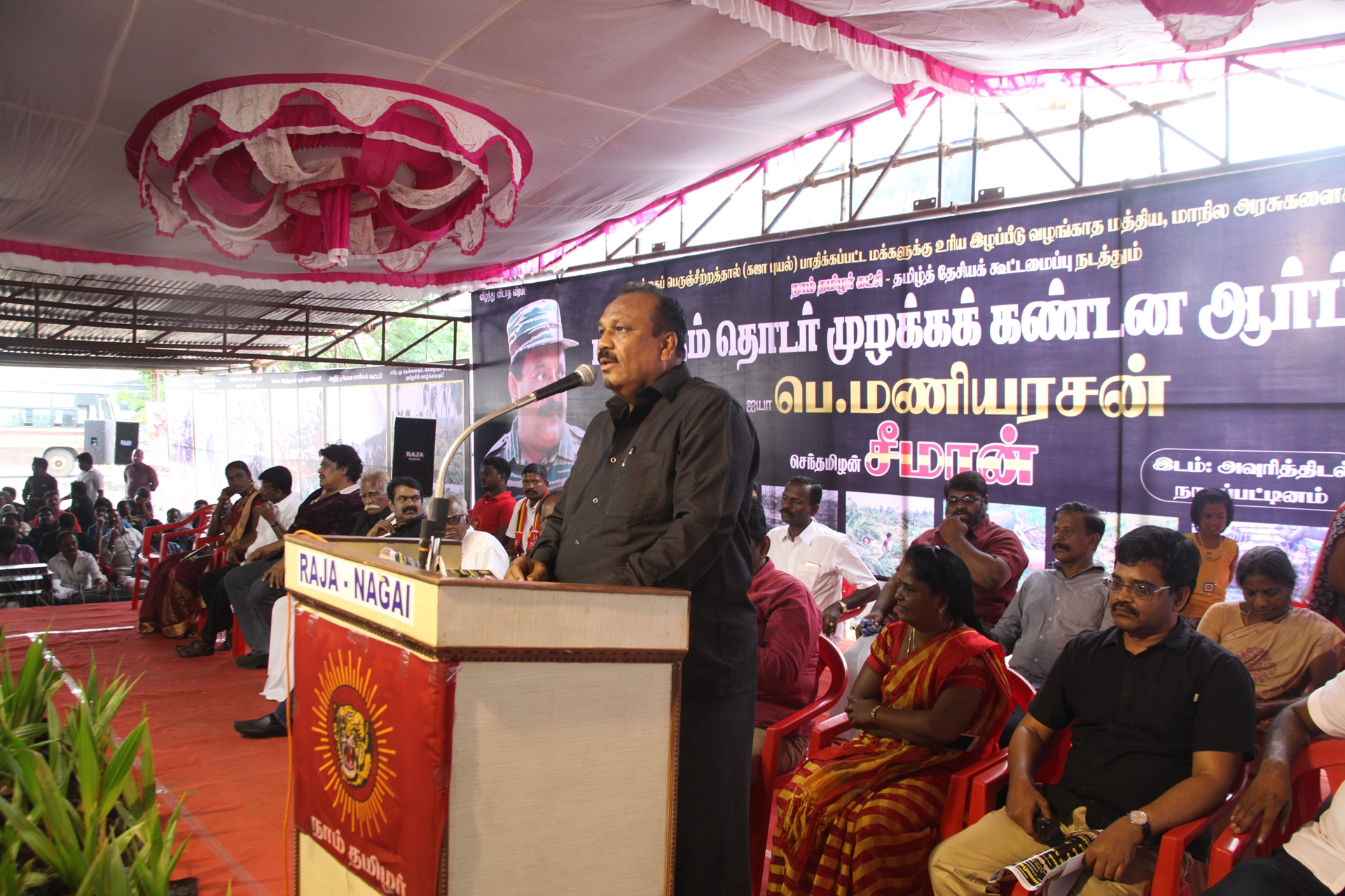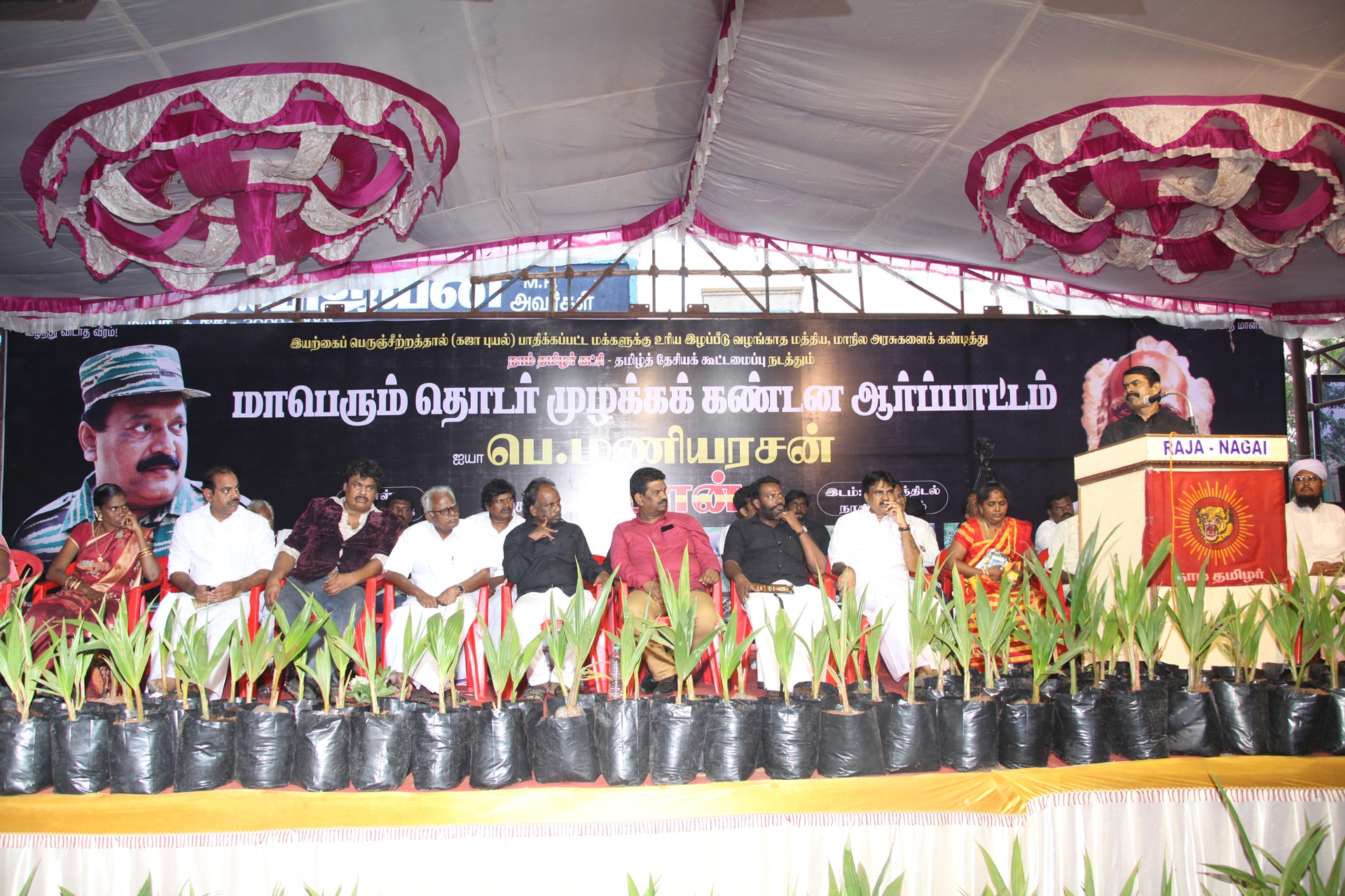 கஜா எனும் பெரும்புயலின் கடுஞ்சீற்றத்தால் தமிழகத்தின் வளமான 8 மாவட்டங்கள் பெரும்பாதிப்பிற்குள்ளாகியுள்ளது. புயலால் பாதிக்கப்பட்டு 40 நாள்களுக்கு மேலாகியும் மீளமுடியாது கண்ணீரில் தத்தளிக்கும் மக்களைப் புறக்கணிக்கும் மத்திய, மாநில அரசுகளைக் கண்டித்து நாம் தமிழர் கட்சி மற்றும் தமிழ்த்தேசியக் கூட்டமைப்பு நடத்தும் மாபெரும் தொடர் முழக்க கண்டன ஆர்ப்பாட்டம் நேற்று 29-12-2018 சனிக்கிழமை காலை 10 மணிமுதல் மாலை 06 மணிவரையிலும் நாகப்பட்டினம் அவுரித் திடலில் தமிழ்த்தேசியப் பேரியக்கத்தின் தலைவர் பெ.மணியரசன் தலைமையில் நடைபெற்றது.