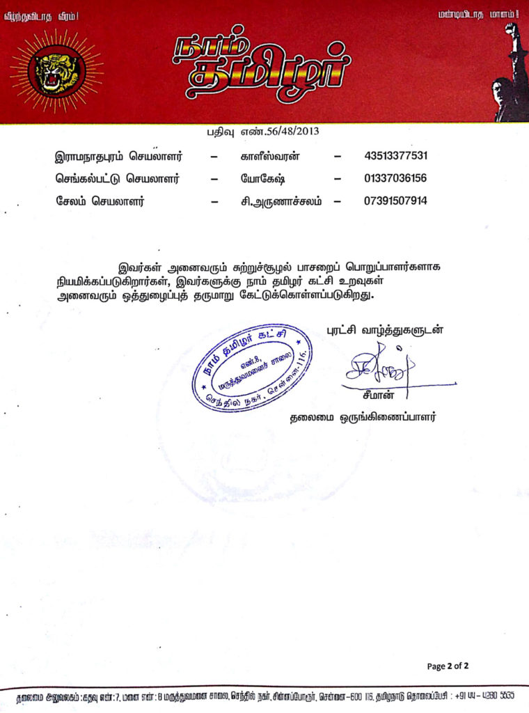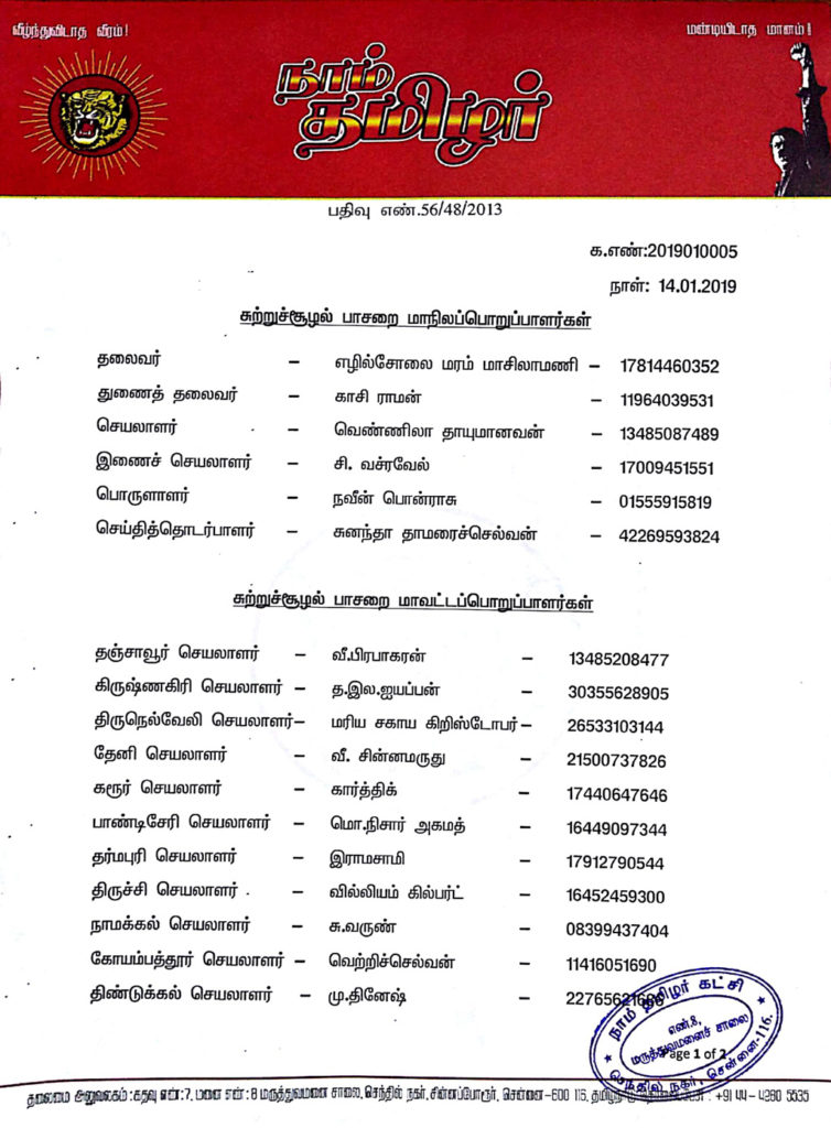 மேற்காண் அனைவரும் சுற்றுச்சூழல் பாசறை பொறுப்பாளர்களாக இன்று 14-01-2019 தலைமை ஒருங்கிணைப்பாளர் சீமான் அவர்களால் (க.எண்: 2019010005) அறிவிக்கப்பட்டுள்ளனர், இவர்களுக்கு நாம் தமிழர் கட்சி உறவுகள் அனைவரும் முழு ஒத்துழைப்பு நல்குமாறு கேட்டுக்கொள்ளப்படுகிறது.