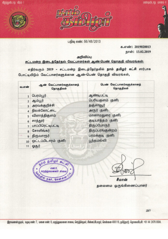 அறிவிப்பு: சட்டமன்றத் தேர்தல் ஆண்-பெண் வேட்பாளர்களுக்கான தொகுதி விவரங்கள் |  நாம் தமிழர் கட்சி