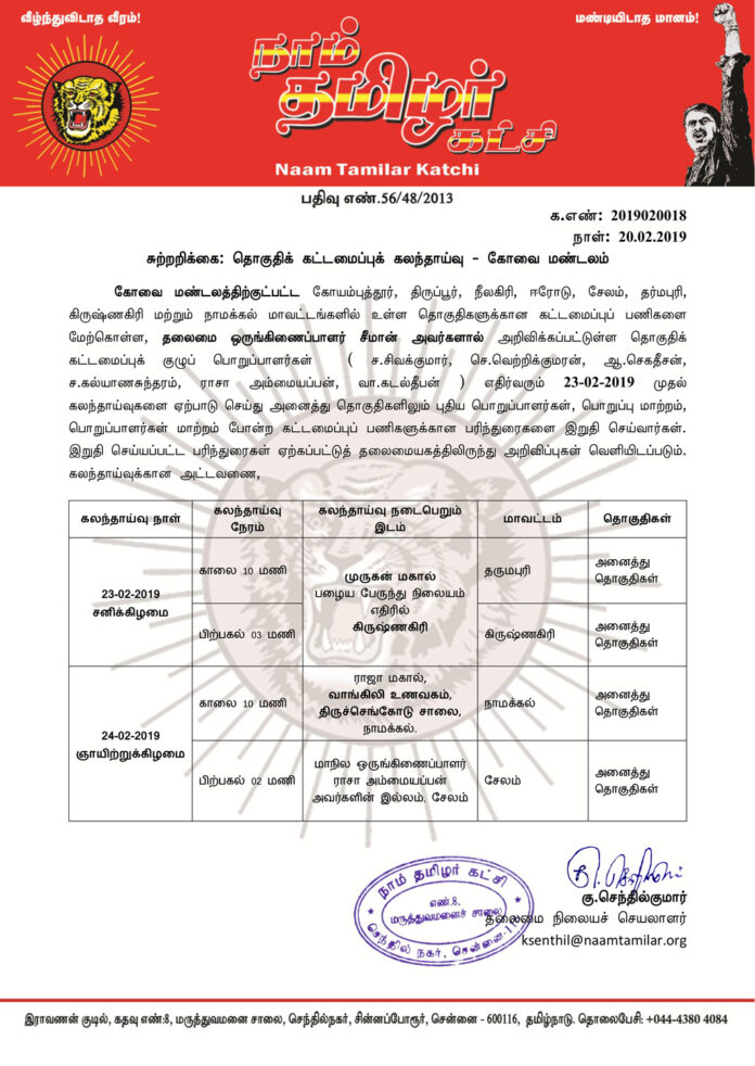 கோவை மண்டலத்திற்குட்பட்ட கோயம்புத்தூர், திருப்பூர், நீலகிரி, ஈரோடு, சேலம், தர்மபுரி, கிருஷ்ணகிரி மற்றும் நாமக்கல் மாவட்டங்களில் உள்ள தொகுதிகளுக்கான கட்டமைப்புப் பணிகளை மேற்கொள்ள, தலைமை ஒருங்கிணைப்பாளர் சீமான் அவர்களால் அறிவிக்கப்பட்டுள்ள தொகுதிக் கட்டமைப்புக் குழுப் பொறுப்பாளர்கள் ( ச.சிவக்குமார், செ.வெற்றிக்குமரன், ஆ.செகதீசன், ச.கல்யாணசுந்தரம், ராசா அம்மையப்பன், வா.கடல்தீபன் ) எதிர்வரும் 23-02-2019 முதல் கலந்தாய்வுகளை ஏற்பாடு செய்து அனைத்து தொகுதிகளிலும் புதிய பொறுப்பாளர்கள், பொறுப்பு மாற்றம், பொறுப்பாளர்கள் மாற்றம் போன்ற கட்டமைப்புப் பணிகளுக்கான பரிந்துரைகளை இறுதி செய்வார்கள். இறுதி செய்யப்பட்ட பரிந்துரைகள் ஏற்கப்பட்டுத் தலைமையகத்திலிருந்து அறிவிப்புகள் வெளியிடப்படும். கலந்தாய்வுக்கான அட்டவணை,