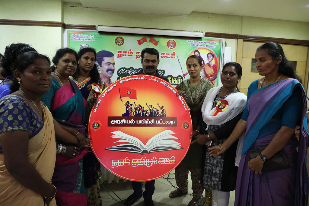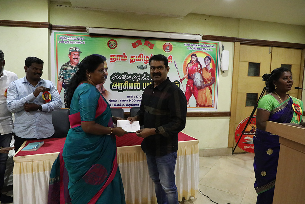 கடந்த 17-02-2019 ஞாயிற்றுக்கிழமை திருச்சியில் உள்ள தனியார் அரங்கில் நடைபெற்ற பெண்களுக்கான அரசியல் பயிற்சி பட்டறைத் தொடக்கவிழாவில் நாம் தமிழர் கட்சி தலைமை ஒருங்கிணைப்பாளர் சீமான் அவர்களிடம் எதிர்வரும் நாடாளுமன்றத் தேர்தல் பணிகளுக்காக மகளிர் பாசறை சார்பாக மாநில மகளிர் பாசறை ஒருங்கிணைப்பாளர் அமுதாநம்பி அவர்கள் ஒரு இலட்சம் ரூபாய்க்கான காசோலை வழங்கினார். பெண்கள் சம உரிமைபெற்று சகல அடக்குமுறைகளிலிருந்தும் விடுதலைப்பெற்று ஆண்களுடன் சமத்துவமாக கௌரவமாக வாழக்கூடிய புரட்சிகரச் சமுதாயம் அமைய வேண்டும் என்பதே எனது ஆவல் என்ற நமது தேசியத்தலைவர் மேதகு வே.பிரபாகரன் அவர்களின் கூற்றுக்கிணங்க நாடாளுமன்றத் தேர்தலில் போட்டியிட பெண்களுக்கு 50% தொகுதிகளை ஒதுக்கீடு செய்து தலைமை ஒருங்கிணைப்பாளர் சீமான் அறிவித்துள்ளார். தமிழக வீதியெங்கும் தேர்தல் பரப்புரையில் ஈடுபட்டு கட்சிக் கொள்கைகளையும் திட்டங்களையும் கொண்டு சேர்த்திடும் பெரும்பணியில் மகளிர் பாசறை இன்றியமையாப் பங்கு வகிக்கும் என உறுதியளிக்கப்பட்டது.