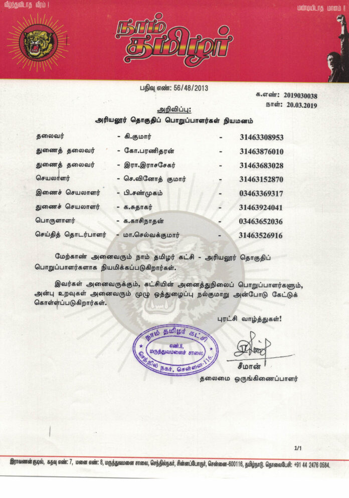 தலைமை அறிவிப்பு: அரியலூர் தொகுதிப் பொறுப்பாளர்கள் நியமனம் | க.எண்:2019030038 | நாம் தமிழர் கட்சி