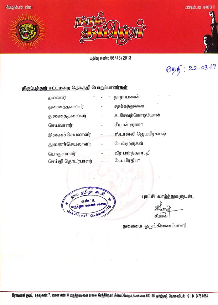 தலைமை அறிவிப்பு: திருப்பத்தூர் தொகுதிப் பொறுப்பாளர்கள் பட்டியல்