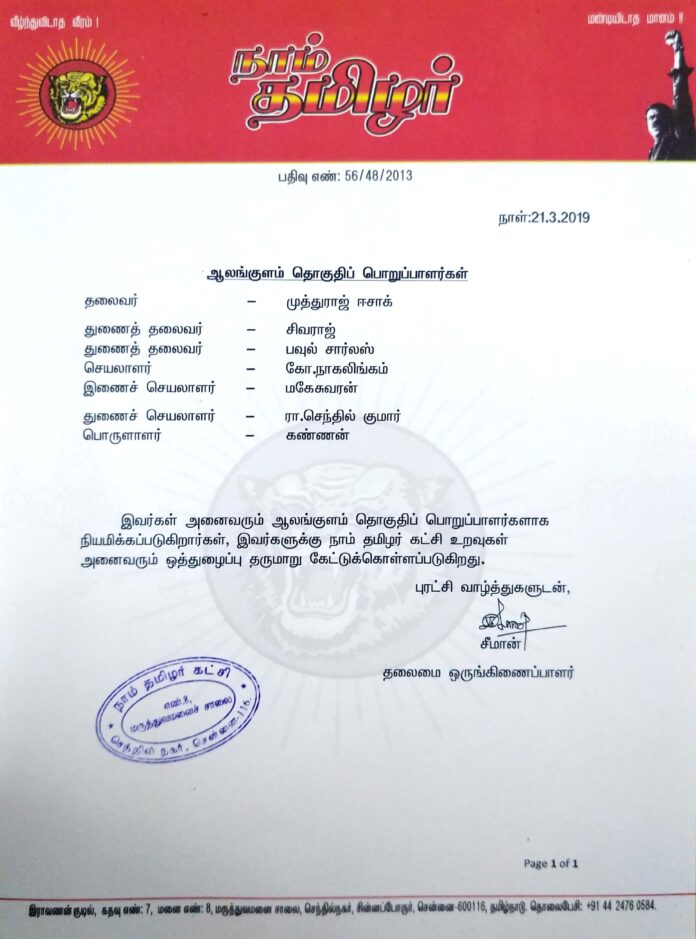 தலைமை அறிவிப்பு: ஆலங்குளம் தொகுதிப் பொறுப்பாளர்கள் பட்டியல்