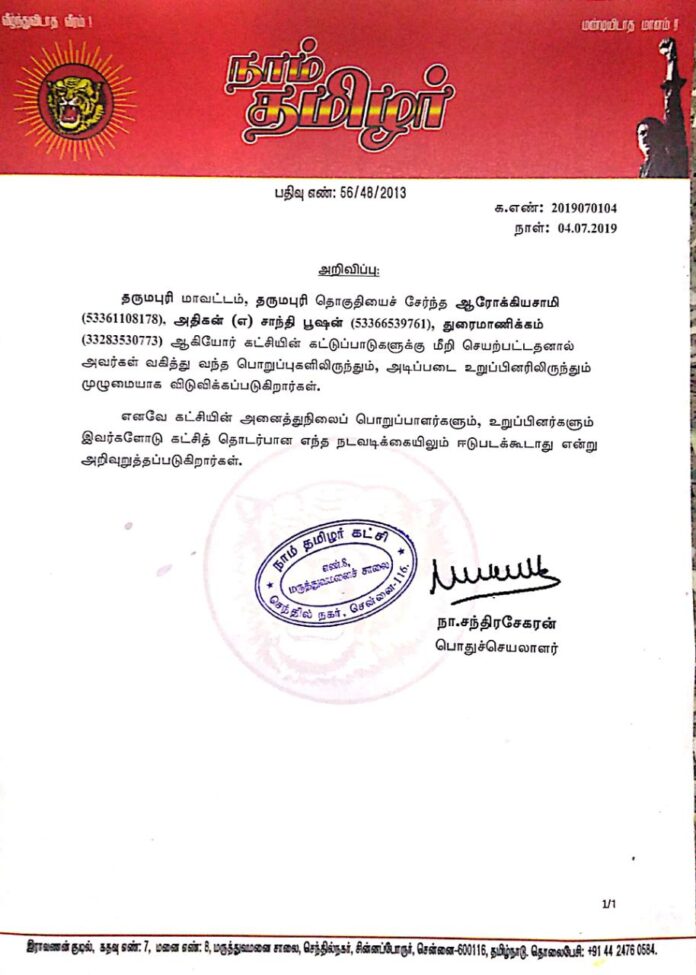 தருமபுரி மாவட்டம், தருமபுரி தொகுதியைச் சேர்ந்த ஆரோக்கியசாமி (53361108178), அதிகன் (எ) சாந்தி பூஷன் (53366539761), துரைமாணிக்கம் (33283530773) ஆகியோர் கட்சியின் கட்டுப்பாடுகளுக்கு மீறி செயற்பட்டதனால் அவர்கள் வகித்து வந்த பொறுப்புகளிலிருந்தும், அடிப்படை உறுப்பினரிலிருந்தும் முழுமையாக விடுவிக்கப்படுவதாக பொதுச்செயலாளர் நா.சந்திரசேகரன் இன்று (க.எண்: 2019070104) அறிவித்துள்ளார்.