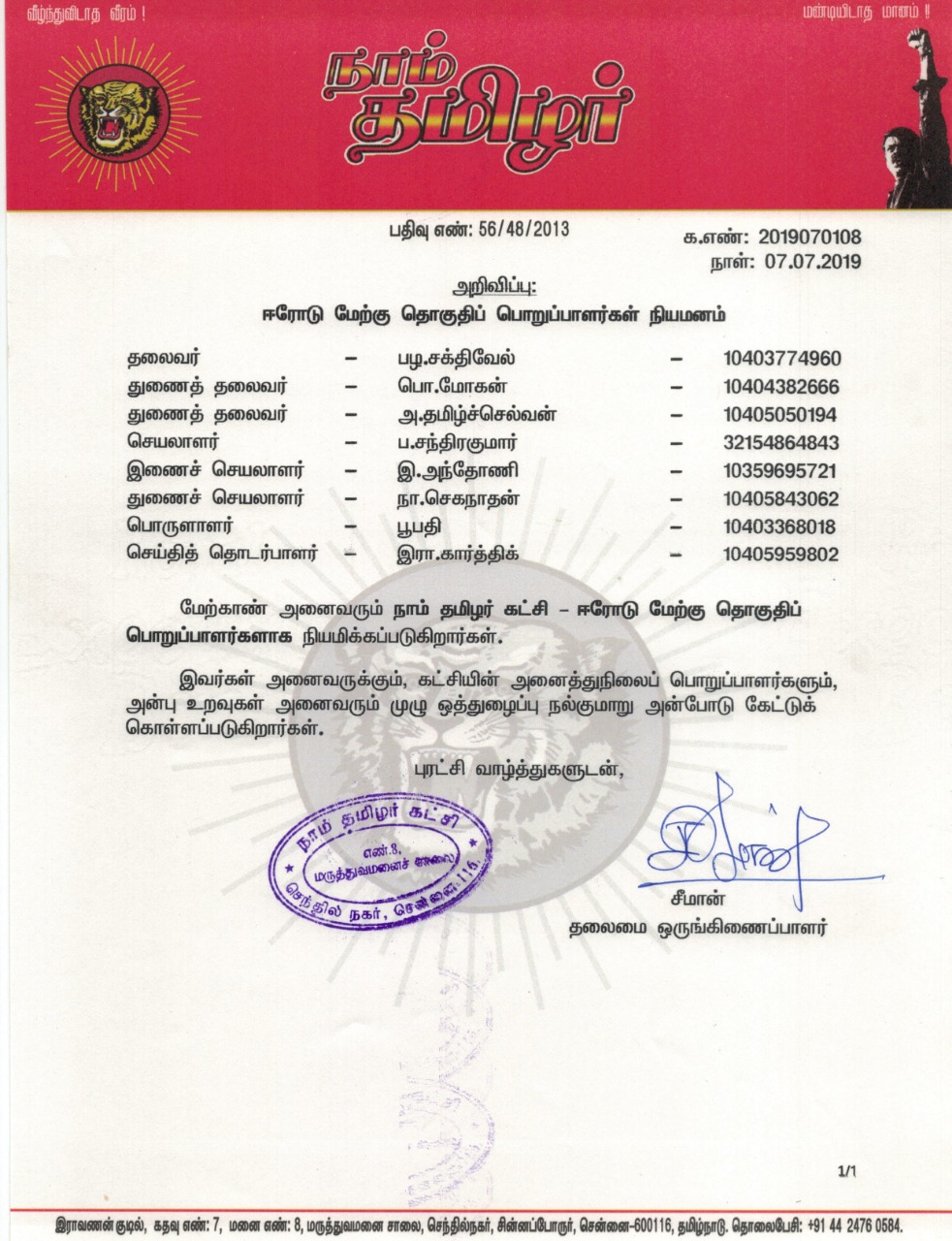 ஈரோடு மேற்கு தொகுதிப் பொறுப்பாளர்கள் நியமனம் | க.எண்: 2019070108 | நாள்: 07.07.2019 | நாம் தமிழர் கட்சி