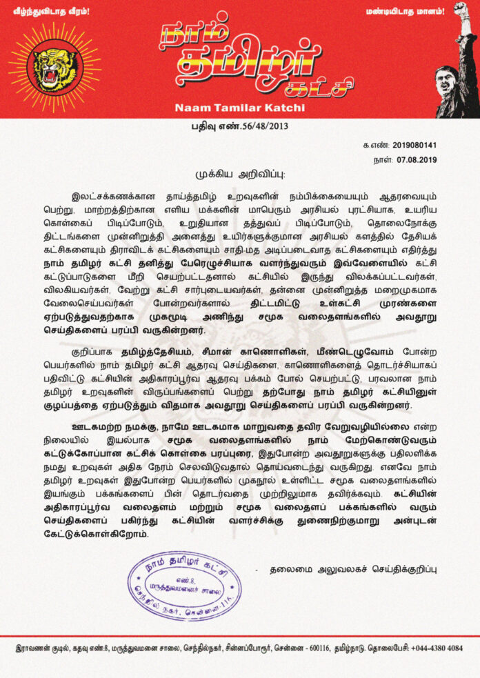 இலட்சக்கணக்கான தாய்த்தமிழ் உறவுகளின் நம்பிக்கையையும் ஆதரவையும் பெற்று, மாற்றத்திற்கான எளிய மக்களின் மாபெரும் அரசியல் புரட்சியாக, உயரிய கொள்கைப் பிடிப்போடும், உறுதியான தத்துவப் பிடிப்போடும், தொலைநோக்கு திட்டங்களை முன்னிறுத்தி அனைத்து உயிர்களுக்குமான அரசியல் களத்தில் தேசியக் கட்சிகளையும் திராவிடக் கட்சிகளையும் சாதி-மத அடிப்படைவாத கட்சிகளையும் எதிர்த்து  நாம் தமிழர் கட்சி தனித்து பேரெழுச்சியாக வளர்ந்துவரும் இவ்வேளையில் கட்சி கட்டுப்பாடுகளை மீறி செயற்பட்டதனால் கட்சியில் இருந்து விலக்கப்பட்டவர்கள், விலகியவர்கள், வேற்று கட்சி சார்புடையவர்கள், தன்னை முன்னிறுத்த மறைமுகமாக வேலைசெய்பவர்கள் போன்றவர்களால் திட்டமிட்டு உள்கட்சி முரண்களை ஏற்படுத்துவதற்காக முகமூடி அணிந்து சமூக வலைதளங்களில் அவதூறு செய்திகளைப் பரப்பி வருகின்றனர்.