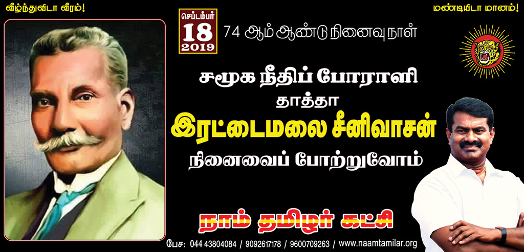 ‘சமூக நீதிப் போராளி’ நமது தாத்தா இரட்டைமலை சீனிவாசன் அவர்களின் 74ஆம் ஆண்டு நினைவுநாளையொட்டி நாம் தமிழர் கட்சி சார்பாக நாளை 18-09-2019 புதன்கிழமை, காலை 10 மணியளவில் *சென்னை, கிண்டியில் அமைந்துள்ள காந்தி மண்டபத்தில் உள்ள தாத்தா இரட்டைமலை சீனிவாசன் அவர்களின் நினைவிடத் திருவுருவச் சிலைக்கு, தலைமை ஒருங்கிணைப்பாளர் சீமான் அவர்கள் மாலை அணிவித்து மலர்வணக்கம் செய்யவிருக்கிறார்.