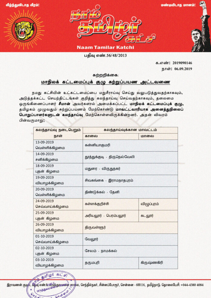 சுற்றறிக்கை: மாநிலக் கட்டமைப்புக் குழு சுற்றுப்பயண அட்டவணை | நாம் தமிழர் கட்சி