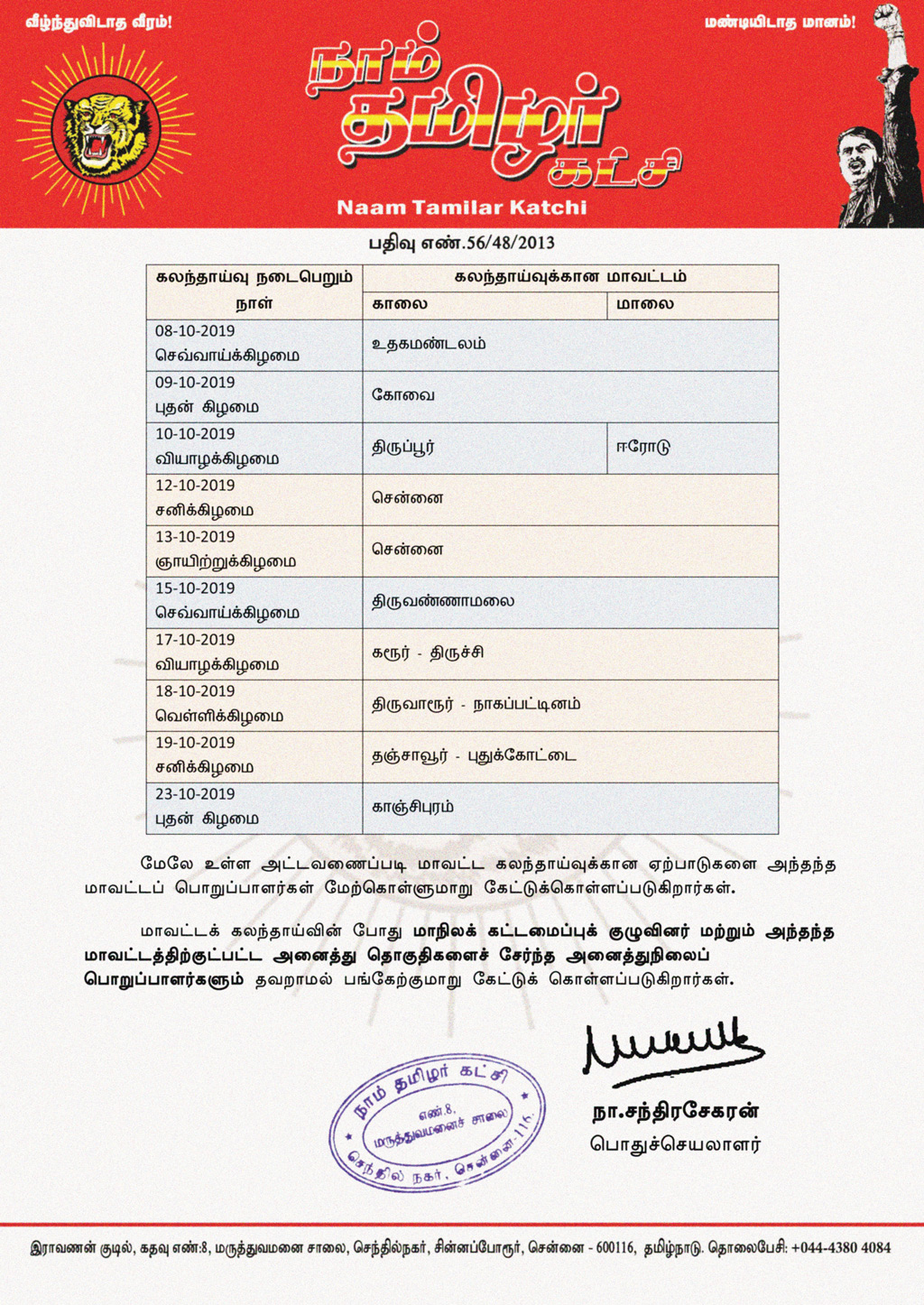 நமது கட்சியின் உட்கட்டமைப்பை மறுசீராய்வு செய்து வலுபடுத்துவதற்காகவும், அடுத்தக்கட்ட செயற்திட்டங்கள் குறித்து கலந்தாய்வு செய்வதற்காகவும், தலைமை ஒருங்கிணைப்பாளர் சீமான் அவர்களால் அமைக்கப்பட்ட மாநிலக் கட்டமைப்புக் குழு, தமிழகம் முழுவதும் சுற்றுப்பயணம் மேற்கொண்டு மாவட்டவாரியாக அனைத்துநிலைப் பொறுப்பாளர்களுடன் கலந்தாய்வு மேற்கொள்ளவிருக்கின்றனர். அதன் விவரம் பின்வருமாறு;