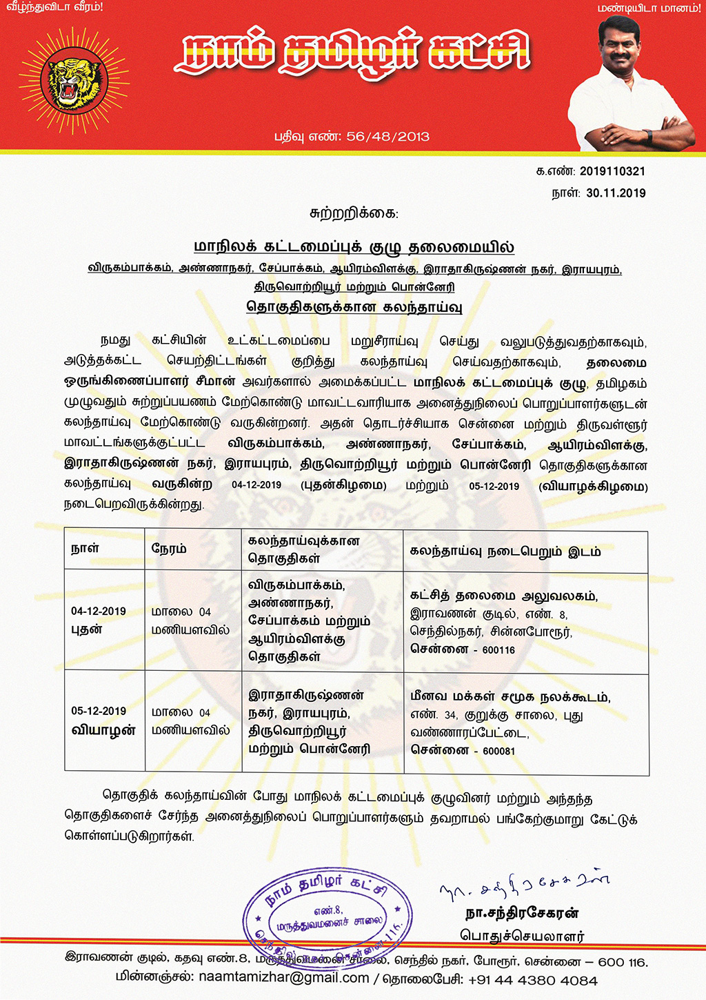 நமது கட்சியின் உட்கட்டமைப்பை மறுசீராய்வு செய்து வலுபடுத்துவதற்காகவும், அடுத்தக்கட்ட செயற்திட்டங்கள் குறித்து கலந்தாய்வு செய்வதற்காகவும், தலைமை ஒருங்கிணைப்பாளர் சீமான் அவர்களால் அமைக்கப்பட்ட மாநிலக் கட்டமைப்புக் குழு, தமிழகம் முழுவதும் சுற்றுப்பயணம் மேற்கொண்டு மாவட்டவாரியாக அனைத்துநிலைப் பொறுப்பாளர்களுடன் கலந்தாய்வு மேற்கொண்டு வருகின்றனர். அதன் தொடர்ச்சியாக சென்னை மற்றும் திருவள்ளூர் மாவட்டங்களுக்குட்பட்ட விருகம்பாக்கம், அண்ணாநகர், சேப்பாக்கம், ஆயிரம்விளக்கு, இராதாகிருஷ்ணன் நகர், இராயபுரம், திருவொற்றியூர் மற்றும் பொன்னேரி தொகுதிகளுக்கான கலந்தாய்வு வருகின்ற 04-12-2019 (புதன்கிழமை) மற்றும் 05-12-2019 (வியாழக்கிழமை) நடைபெறவிருக்கின்றது.