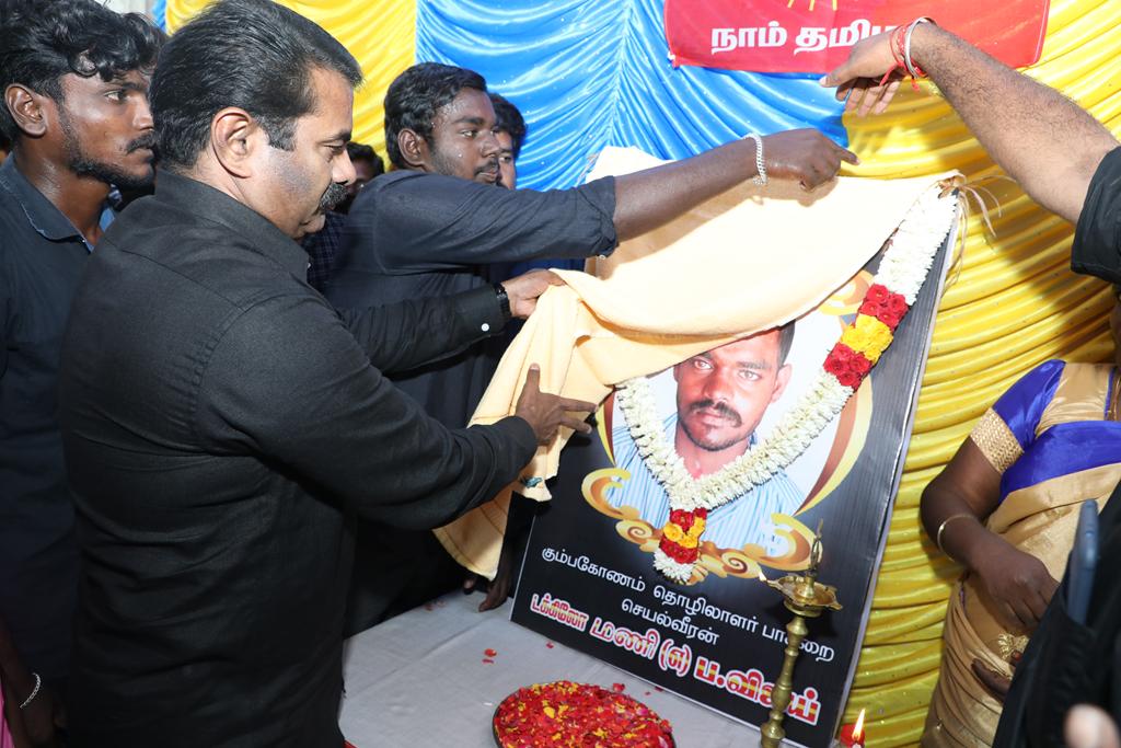 அண்மையில் மறைந்த நாம் தமிழர் கட்சி – கும்பகோணம் தொகுதி – தொழிலாளர் பாசறையைச் சேர்ந்த தம்பி டக்கிலோ மணி (எ) ப.விஜய் அவர்களின் திருவுருவப் படத்தை நாம் தமிழர் கட்சியின் தலைமை ஒருங்கிணைப்பாளர் சீமான் அவர்கள் திறந்து வைத்து புகழ் வணக்கம் செலுத்தி; அவரை இழந்து வாடும் பெற்றோர் மற்றும் குடும்பத்தினருக்கு ஆறுதல் கூறினார்.