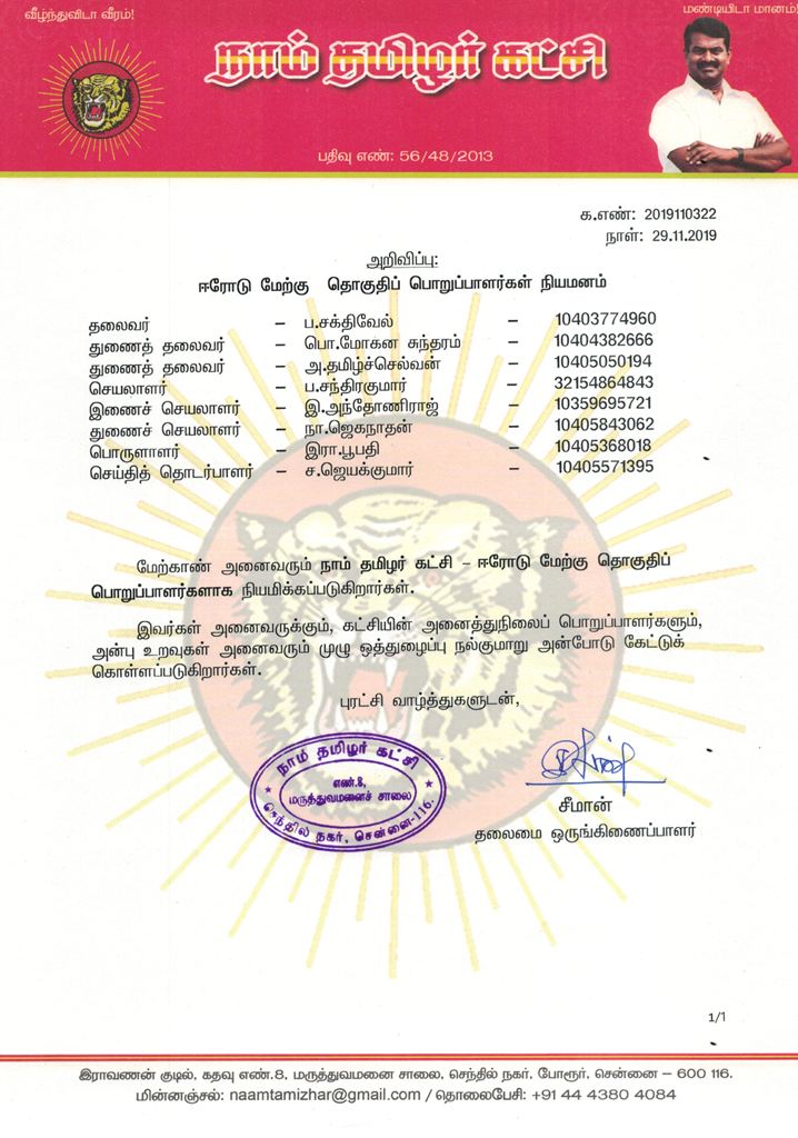 தலைமை அறிவிப்பு: ஈரோடு-மேற்கு தொகுதிப் பொறுப்பாளர்கள் நியமனம்