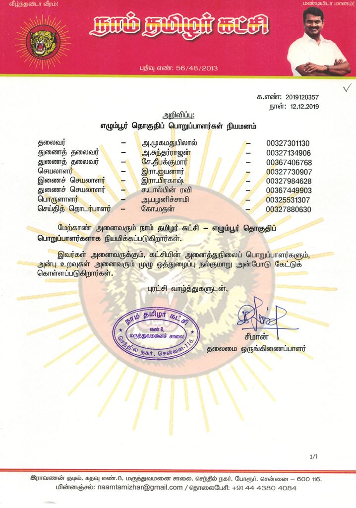 தலைமைச் செய்திகள்கட்சி செய்திகள்தமிழ்நாட்டுக் கிளைகள்சென்னை மாவட்டம்அறிவிப்புகள்எழும்பூர் தலைமை அறிவிப்பு: எழும்பூர் தொகுதிப் பொறுப்பாளர்கள் நியமனம் – 2019 டிசம்பர் 31, 2019 42