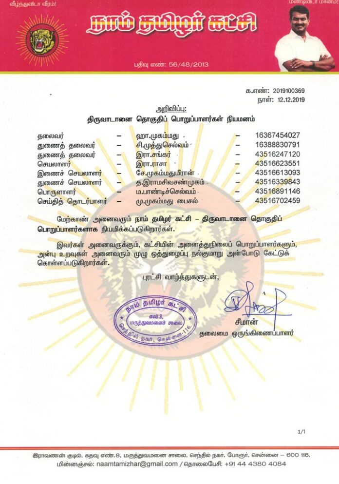 தலைமை அறிவிப்பு: திருவாடானை தொகுதிப் பொறுப்பாளர்கள் நியமனம்