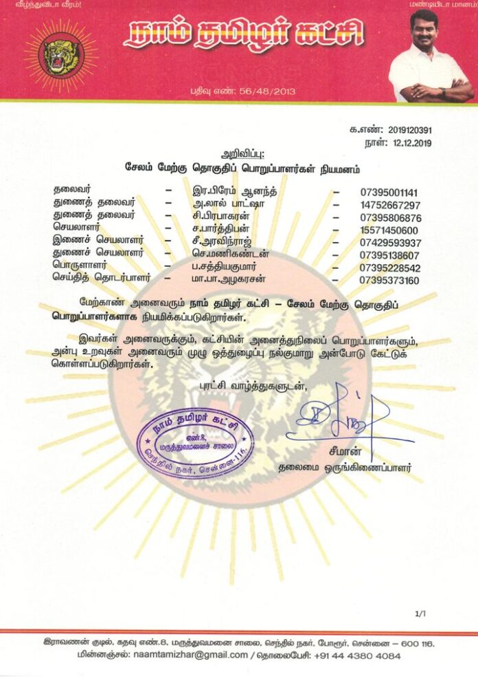 தலைமைச் செய்திகள்கட்சி செய்திகள்அறிவிப்புகள்பொறுப்பாளர்கள் நியமனம் தலைமை அறிவிப்பு: சேலம் மேற்கு தொகுதிப் பொறுப்பாளர்கள் நியமனம் டிசம்பர் 31, 2019 56