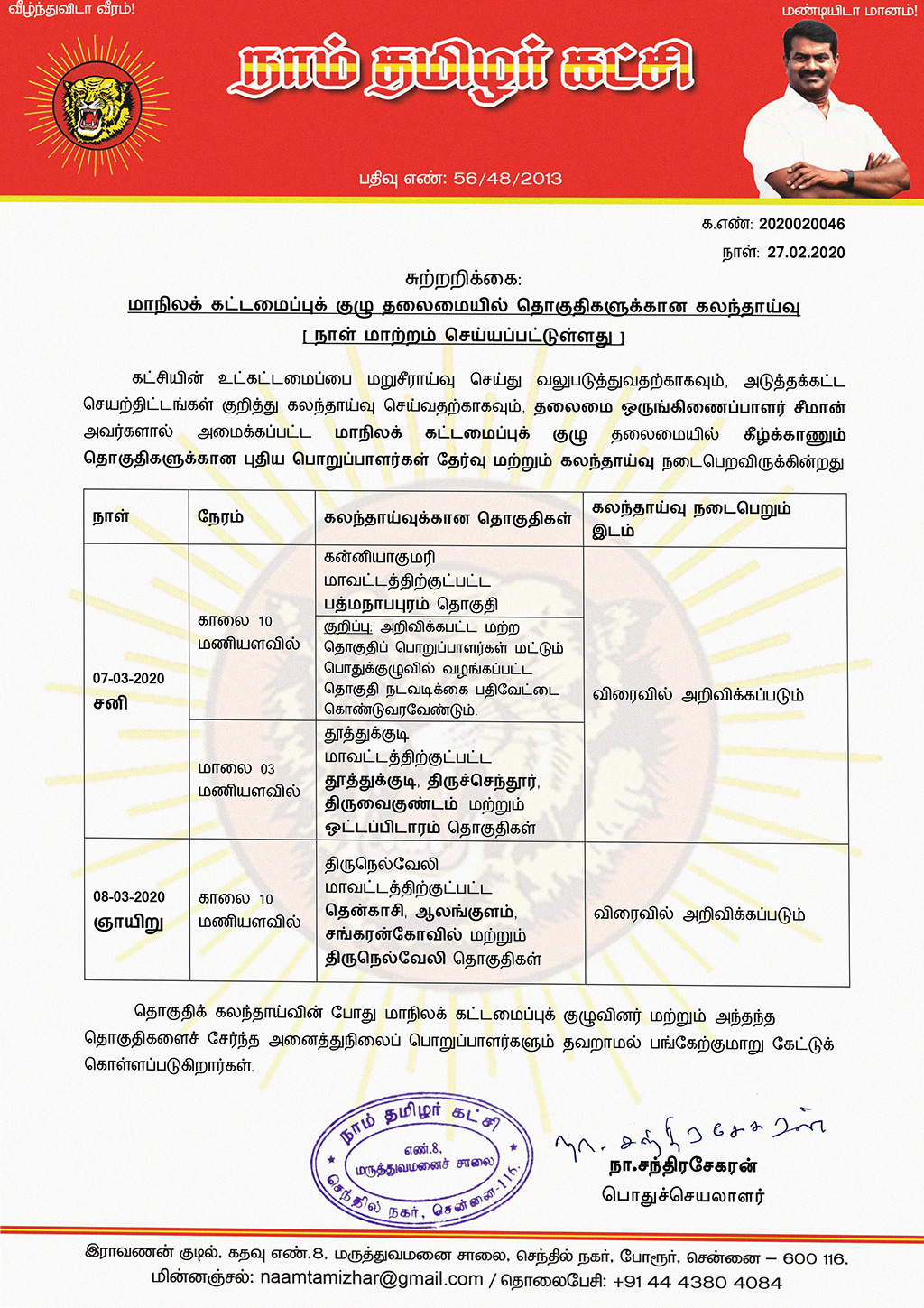 கட்சியின் உட்கட்டமைப்பை மறுசீராய்வு செய்து வலுபடுத்துவதற்காகவும், அடுத்தக்கட்ட செயற்திட்டங்கள் குறித்து கலந்தாய்வு செய்வதற்காகவும், தலைமை ஒருங்கிணைப்பாளர் சீமான் அவர்களால் அமைக்கப்பட்ட மாநிலக் கட்டமைப்புக் குழு தலைமையில் கீழ்க்காணும் தொகுதிகளுக்கான புதிய பொறுப்பாளர்கள் தேர்வு மற்றும் கலந்தாய்வு நடைபெறவிருக்கின்றது