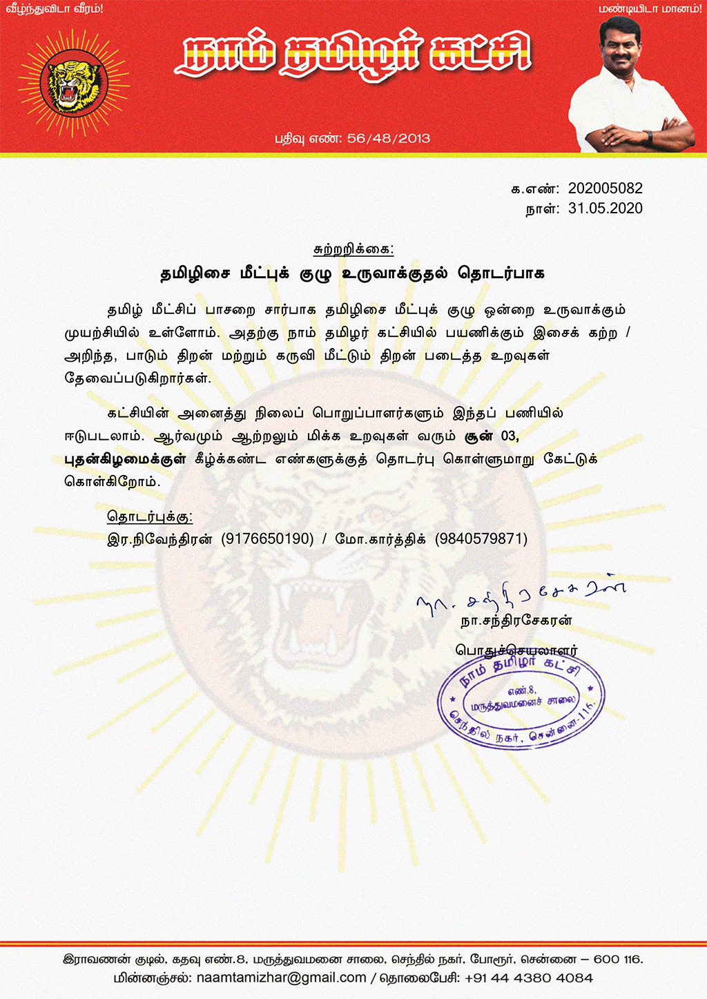 தமிழ் மீட்சிப் பாசறை சார்பாக தமிழிசை மீட்புக் குழு ஒன்றை உருவாக்கும் முயற்சியில் உள்ளோம். அதற்கு நாம் தமிழர் கட்சியில் பயணிக்கும் இசைக் கற்ற / அறிந்த, பாடும் திறன் மற்றும் கருவி மீட்டும் திறன் படைத்த உறவுகள் தேவைப்படுகிறார்கள்.