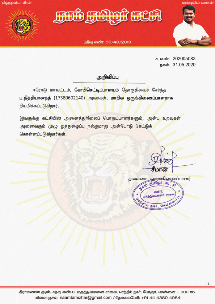 இவருக்கு கட்சியின் அனைத்துநிலைப் பொறுப்பாளர்களும், அன்பு உறவுகள் அனைவரும் முழு ஒத்துழைப்பு நல்குமாறு அன்போடு கேட்டுக் கொள்ளப்படுகிறார்கள்.