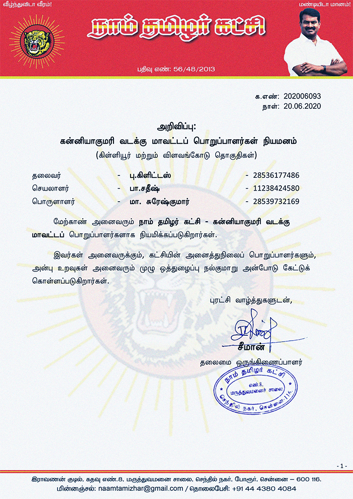 மேற்காண் அனைவரும் நாம் தமிழர் கட்சி – கன்னியாகுமரி வடக்கு மாவட்டப் பொறுப்பாளர்களாக நியமிக்கப்படுகிறார்கள்.